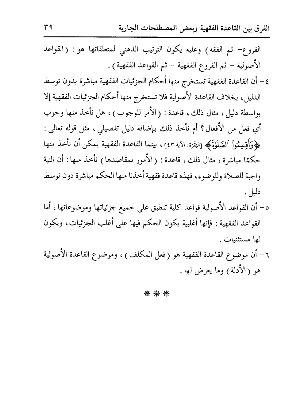 6 - أن موضوع القاعدة الفقهية هو (فعل المكلف)، وموضوع القاعدة الأصولية هو (الأدلة) وما يعرض لها.