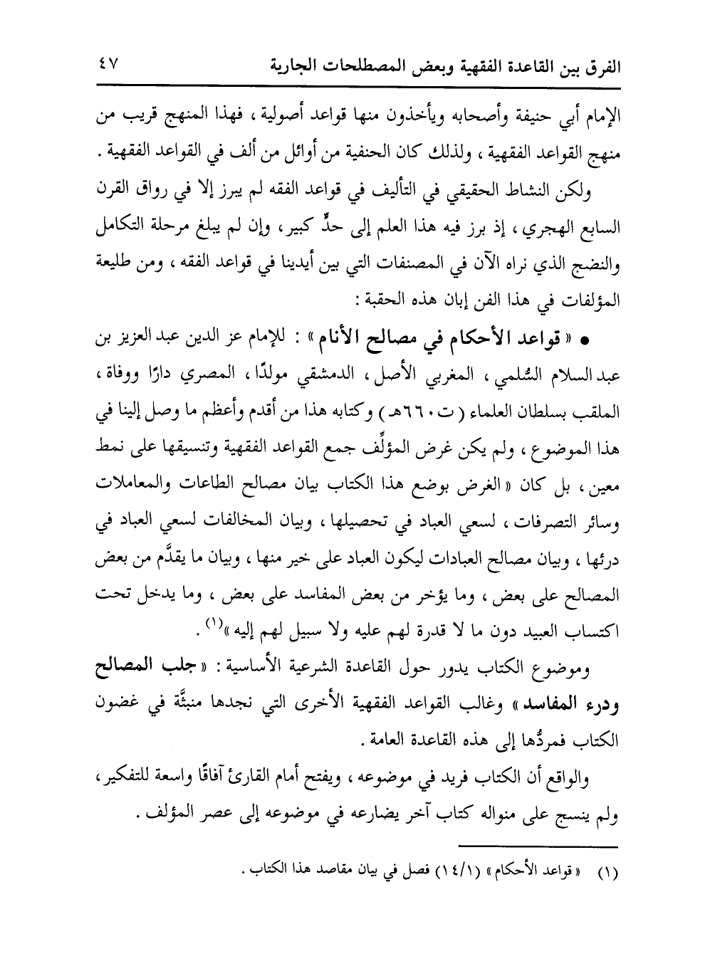 • "قواعد الأحكام في مصالح الأنام": للإمام عز الدين عبد العزيز بن عبد السلام السُّلمي، المغربي الأصل، الدمشقي مولدًا، المصري دارًا ووفاة، الملقب بسلطان العلماء (ت 660 هـ) وكتابه هذا من أقدم وأعظم ما وصل إلينا في هذا الموضوع، ولم يكن غرض المؤلِّف جمع القواعد الفقهية وتنسيقها على نمط معين، بل كان "الغرض بوضع هذا الكتاب بيان مصالح الطاعات والمعاملات وسائر التصرفات، لسعي العباد في تحصيلها، وبيان المخالفات لسعي العباد في درئها، وبيان مصالح العبادات ليكون العباد على خير منها، وبيان ما يقدَّم من بعض المصالح على بعض، وما يؤخر من بعض المفاسد على بعض، وما يدخل تحت اكتساب العبيد دون ما لا قدرة لهم عليه ولا سبيل لهم إليه" (¬1).