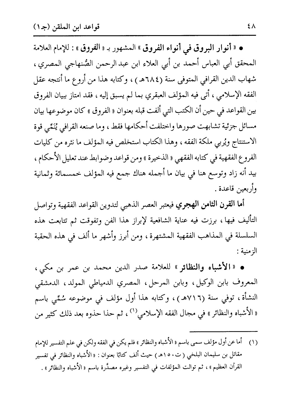 • "أنوار البروق في أنواء الفروق" المشهور بـ "الفروق": للإمام العلامة المحقق أبي العباس أحمد بن أبي العلاء ابن عبد الرحمن الصُّنهاجي المصري، شهاب الدين القرافي المتوفى سنة (684 هـ)، وكتابه هذا من أروع ما أنتجه عقل الفقه الإسلامي، أتى فيه المؤلف العبقري بما لم يسبق إليه، فقد امتاز ببيان الفروق بين القواعد في حين أن الكتب التي ألفت قبله بعنوان "الفروق" كان موضوعها بيان مسائل جزئية تشابهت صورها واختلفت أحكامها فقط، وما صنعه القرافي يُنَمِّي قوة الاستنتاج ويُربي ملكة الفقه، وهذا الكتاب استخلص فيه المؤلف ما نثره من كليات الفروع الفقهية في كتابه الفقهي "الذخيرة" ومن قواعد وضوابط عند تعليل الأحكام، بيد أنه زاد وتوسع هنا في بيان ما أجمله هناك جمع فيه المؤلف خمسمائة وثمانية وأربعين قاعدة.