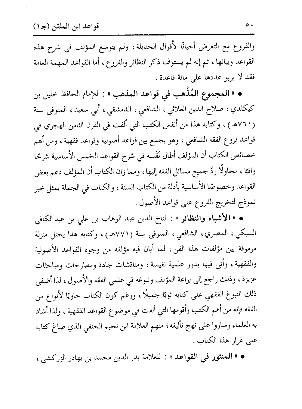 • "المجموع المُذْهب في قواعد المذهب": للإمام الحافظ خليل بن كيكلدي، صلاح الدين العلائي، الشافعي، الدمشقي، أبي سعيد، المتوفى سنة (761 هـ)، وكتابه هذا من أنفس الكتب التي ألفت في القرن الثامن الهجري في قواعد فروع الفقه الشافعي، وهو يجمع بين قواعد أصولية وقواعد فقهية، ومن أهم خصائص الكتاب أن المؤلف أطال نَفَسه في شرح القواعد الخمس الأساسية شرحًا وافيًا، محاولًا ردَّ جميع مسائل الفقه إليها، ومما زان الكتاب أن المؤلف دعم بعض القواعد وخصوصًا الأساسية بأدلة من الكتاب السنة، والكتاب في الجملة يمثل خير نموذج لتخريج الفروع على قواعد الأصول.