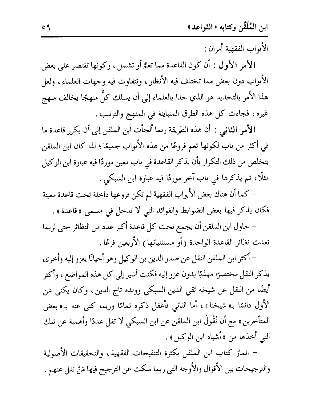 الأمر الثاني: أن هذه الطريقة ربما ألجأت ابن الملقن إلى أن يكرر قاعدة ما في أكثر من باب لكونها تعم فروعًا من هذه الأبواب جميعًا، لذا كان ابن الملقن يتخلص من ذلك التكرار بأن يذكر القاعدة في باب معين موردًا فيه عبارة ابن الوكيل مثلًا، ثم يذكرها في باب آخر موردًا فيه عبارة ابن السبكي.