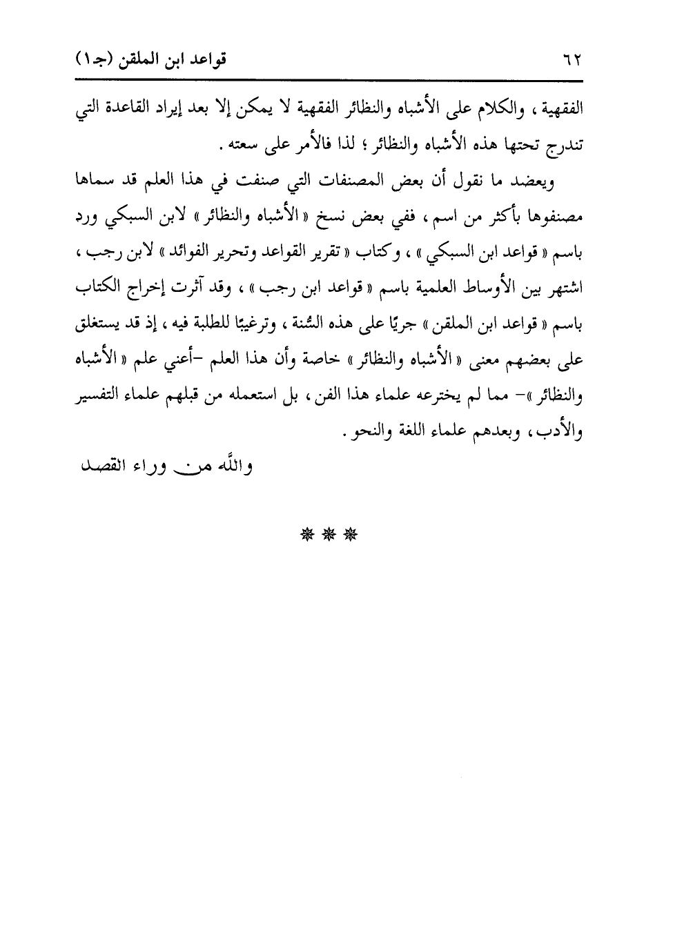 ويعضد ما نقول أن بعض المصنفات التي صنفت في هذا العلم قد سماها مصنفوها بأكثر من اسم، ففي بعض نسخ "الأشباه والنظائر" لابن السبكي ورد باسم "قواعد ابن السبكي"، وكتاب "تقرير القواعد وتحرير الفوائد" لابن رجب، اشتهر بين الأوساط العلمية باسم "قواعد ابن رجب"، وقد آثرت إخراج الكتاب باسم "قواعد ابن الملقن" جريًا على هذه السُّنة، وترغيبًا للطلبة فيه، إذ قد يستغلق على بعضهم معنى "الأشباه والنظائر" خاصة وأن هذا العلم -أعني علم "الأشباه والنظائر"- مما لم يخترعه علماء هذا الفن، بل استعمله من قبلهم علماء التفسير والأدب، وبعدهم علماء اللغة والنحو.