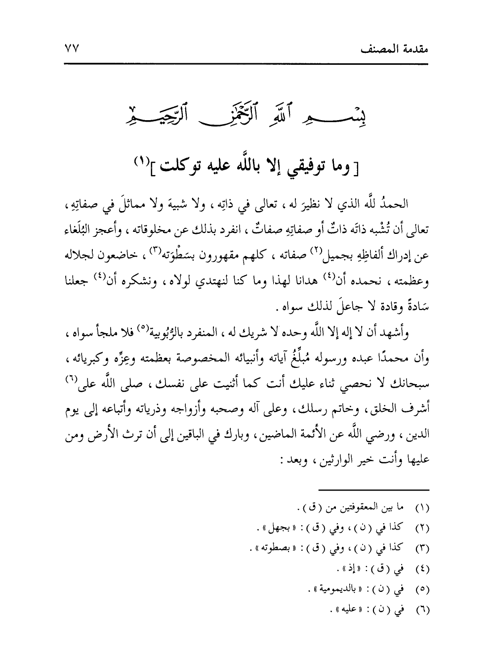 الحمدُ لله الذي لا نظيرَ له، تعالى في ذاتِه، ولا شبيهَ ولا مماثلَ في صفاتِهِ، تعالى أن تُشْبه ذاتَه ذاتٌ أو صفاتِهِ صفاتٌ، انفرد بذلك عن مخلوقاته، وأعجز البُلَغاء عن إدراك ألفاظِهِ بجميل (¬2) صفاته، كلهم مقهورون بسَطْوَته (¬3)، خاضعون لجلاله وعظمته، نحمده أن (¬4) هدانا لهذا وما كنا لنهتدي لولاه، ونشكره أن (4) جعلنا سَادةً وقادة لا جاعلَ لذلك سواه.