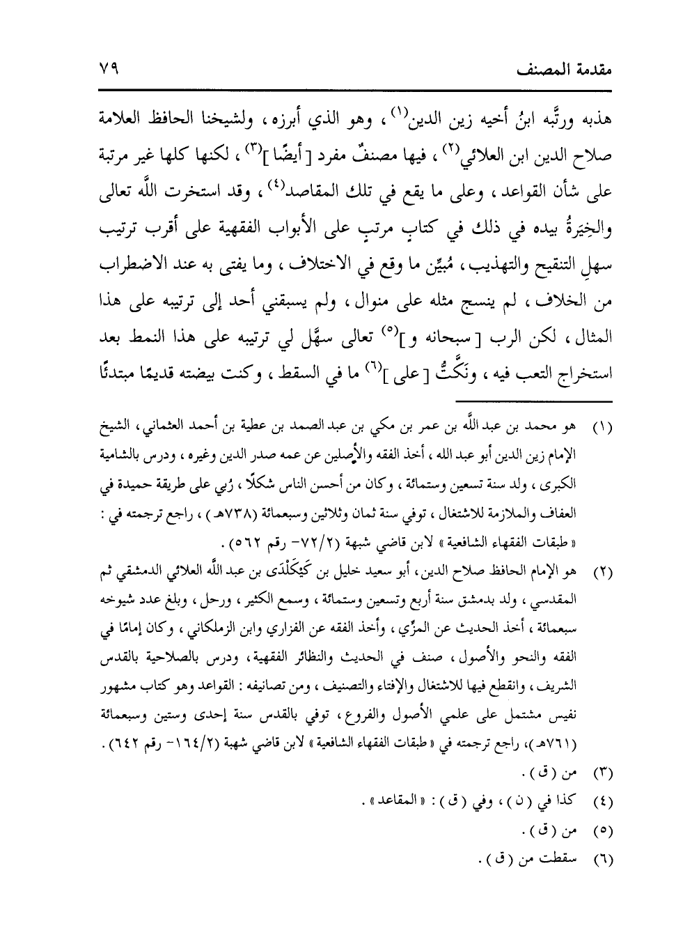 (¬2) هو الإمام الحافظ صلاح الدين، أبو سعيد خليل بن كَيْكَلْدَى بن عبد الله العلائي الدمشقي ثم المقدسي، ولد بدمشق سنة أربع وتسعين وستمائة، وسمع الكثير، ورحل، وبلغ عدد شيوخه سبعمائة، أخذ الحديث عن المزِّي، وأخذ الفقه عن الفزاري وابن الزملكاني، وكان إمامًا في الفقه والنحو والأصول، صنف في الحديث والنظائر الفقهية، ودرس بالصلاحية بالقدس الشريف، وانقطع فيها للاشتغال والإفتاء والتصنيف، ومن تصانيفه: القواعد وهو كتاب مشهور نفيس مشتمل على علمي الأصول والفروع، توفي بالقدس سنة إحدى وستين وسبعمائة (761 هـ)، راجع ترجمته في "طبقات الفقهاء الشافعية" لابن قاضي شهبة (2/ 164 - رقم 642).