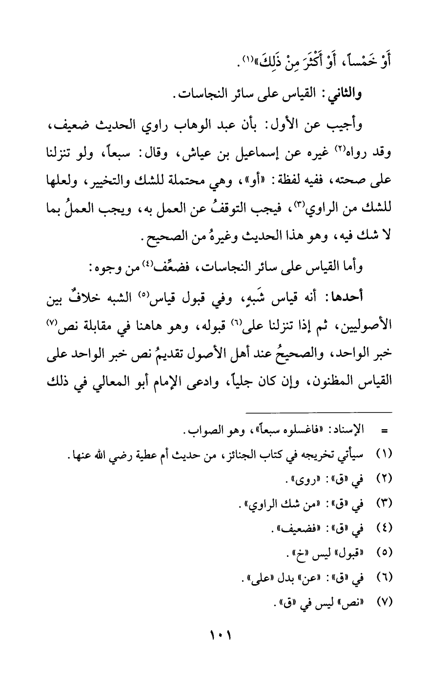 وأجيب عن الأول: بأن عبد الوهاب راوي الحديث ضعيف، وقد رواه (¬2) غيره عن إسماعيل بن عياش، وقال: سبعا، ولو تنزلنا على صحته، ففيه لفظة: «أو»، وهي محتملة للشك والتخيير، ولعلها للشك من الراوي (¬3)، فيجب التوقف عن العمل به، ويجب العمل بما لا شك فيه، وهو هذا الحديث وغيره من الصحيح.