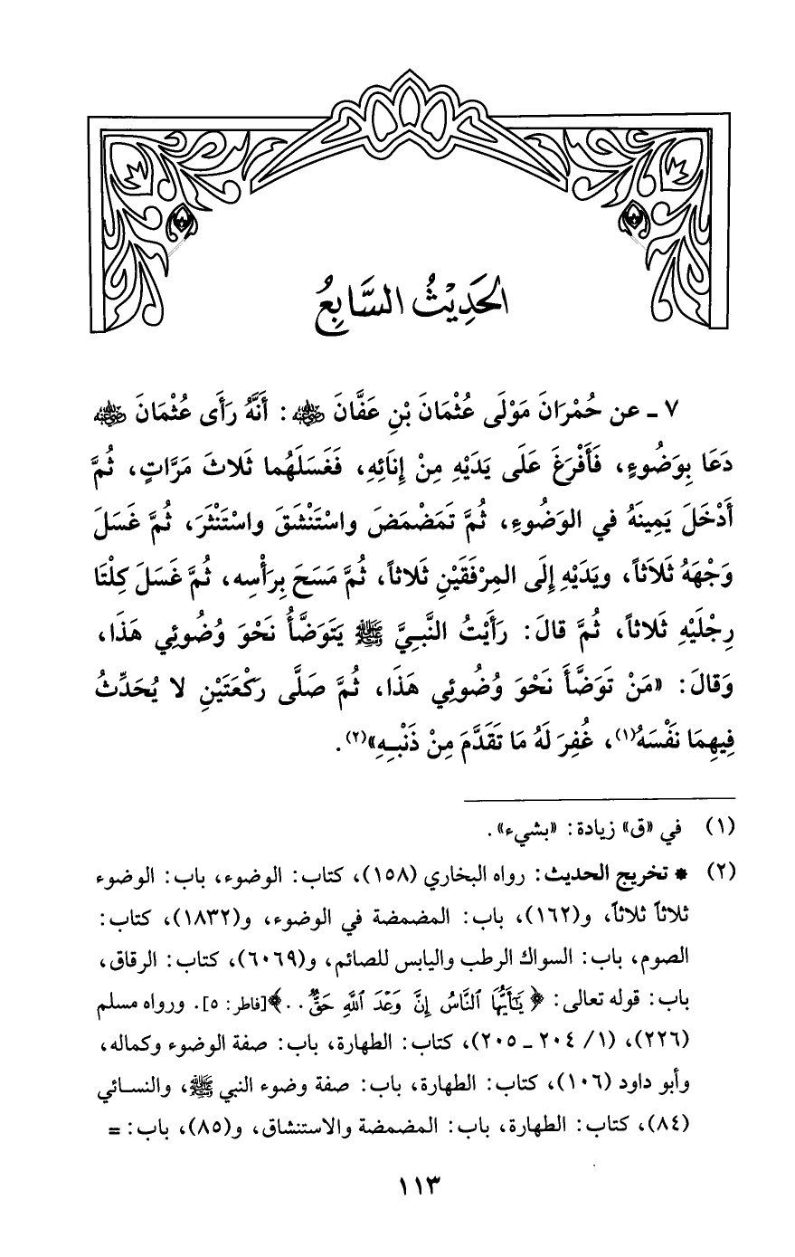 7 - عَنْ حُمْرَانَ مَوْلَى عُثْمَانَ بْنِ عَفَّانَ رضي اللهُ عنه: أَنَّهُ رَأَى عُثْمَانَ - رضي الله عنه - دَعَا بِوَضُوءٍ , فَأَفْرَغَ عَلَى يَدَيْهِ مِنْ إنَائِهِ , فَغَسَلَهُمَا ثَلاثَ مَرَّاتٍ، ثُمَّ أَدْخَلَ يَمِينَهُ فِي الْوَضُوءِ , ثُمَّ تَمَضْمَضَ وَاسْتَنْشَقَ وَاسْتَنْثَرَ، ثُمَّ غَسَلَ وَجْهَهُ ثَلاثاً , وَيَدَيْهِ إلَى الْمِرْفَقَيْنِ ثَلاثًا , ثُمَّ مَسَحَ بِرَأْسِهِ , ثُمَّ غَسَلَ كِلْتَا رِجْلَيْهِ ثَلاثًا , ثُمَّ قَالَ: رَأَيْتُ النَّبِيَّ - صلى الله عليه وسلم - يَتَوَضَّأُ نَحْوَ وُضُوئِي هَذَا، وَقَالَ: «مَنْ تَوَضَّأَ نَحْوَ وُضُوئِي هَذَا , ثُمَّ صَلَّى رَكْعَتَيْنِ , لا يُحَدِّثُ فِيهِمَا نَفْسَهُ (¬1)، غُفِرَ لَهُ مَا تَقَدَّمَ مِنْ ذَنْبِهِ» (¬2).