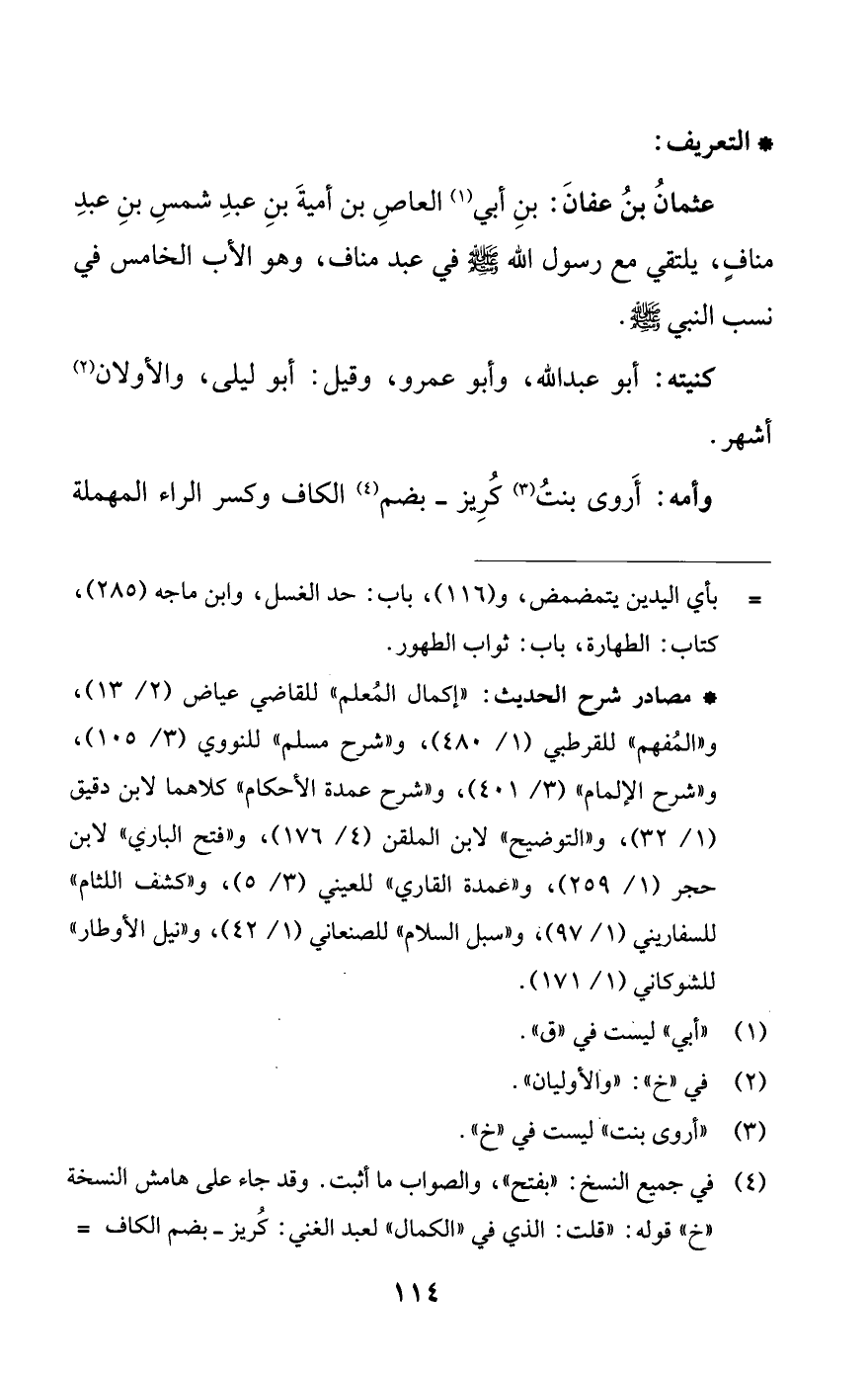 عثمان بن عفان: بن أبي (¬1) العاص بن أمية بن عبد شمس بن عبد مناف، يلتقي مع رسول الله - صلى الله عليه وسلم - في عبد مناف، وهو الأب الخامس في نسب النبي - صلى الله عليه وسلم -.