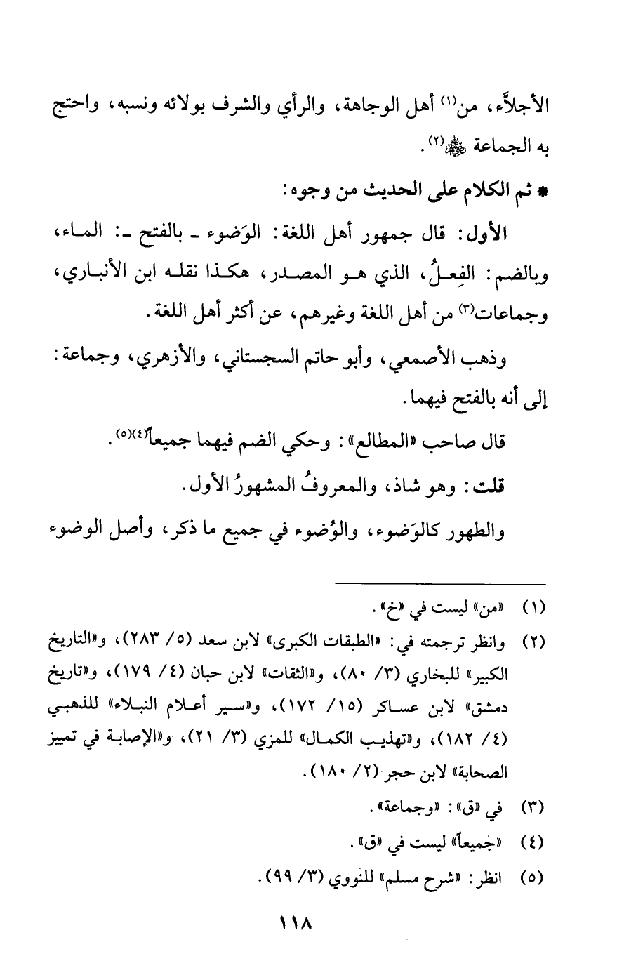 الأول: قال جمهور أهل اللغة: الوضوء -بالفتح-: الماء، وبالضم: الفعل، الذي هو المصدر، هكذا نقله ابن الأنباري، وجماعات (¬3) من أهل اللغة وغيرهم، عن أكثر أهل اللغة.