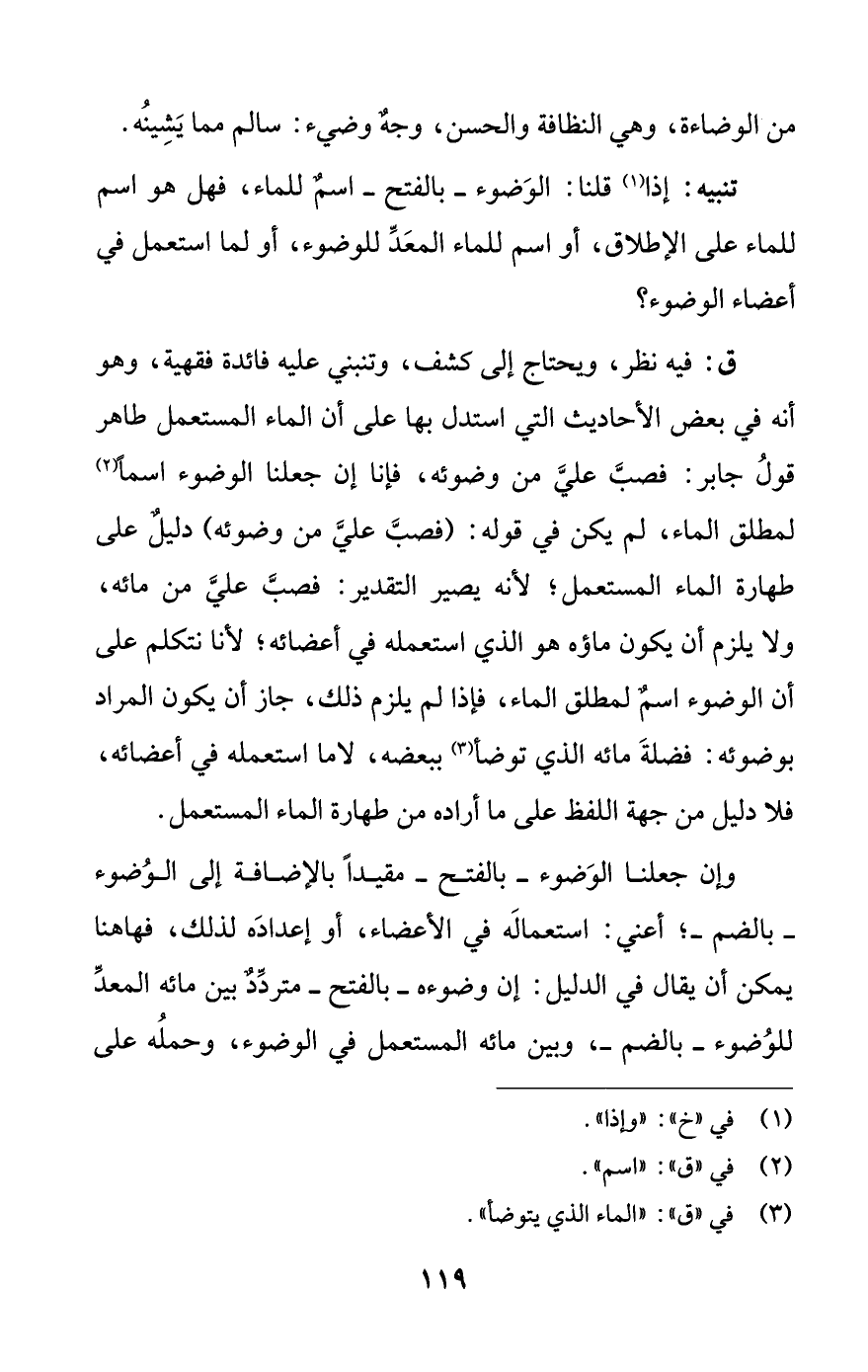 ق: فيه نظر، ويحتاج إلى كشف، وتنبني عليه فائدة فقهية، وهو أنه في بعض الأحاديث التي استدل بها على أن الماء المستعمل طاهر قول جابر: فصب علي من وضوئه، فإنا إن جعلنا الوضوء اسما (¬2) لمطلق الماء، لم يكن في قوله: (فصب علي من وضوئه) دليل على طهارة الماء المستعمل؛ لأنه يصير التقدير: فصب علي من مائه، ولا يلزم أن يكون ماؤه هو الذي استعمله في أعضائه؛ لأنا نتكلم على أن الوضوء اسم لمطلق الماء، فإذا لم يلزم ذلك، جاز أن يكون المراد بوضوئه فضلة مائه الذي توضأ (¬3) ببعضه، لا ما استعمله في أعضائه، فلا دليل من جهة اللفظ على ما أراده من طهارة الماء المستعمل.