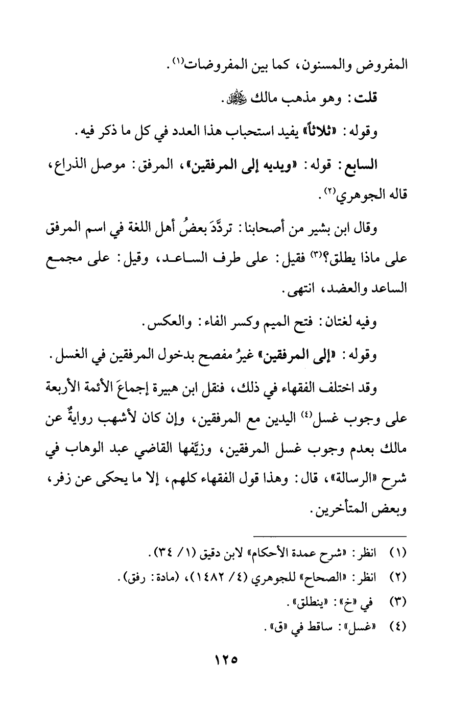 وقوله: «إلى المرفقين» غير مفصح بدخول المرفقين في الغسل. وقد اختلف الفقهاء في ذلك، فنقل ابن هبيرة إجماع الأئمة الأربعة على وجوب غسل (¬4) اليدين مع المرفقين، وإن كان لأشهب رواية عن مالك بعدم وجوب غسل المرفقين، وزيفها القاضي عبد الوهاب في شرح «الرسالة»، قال: وهذا قول الفقهاء كلهم، إلا ما يحكى عن زفر، وبعض المتأخرين.