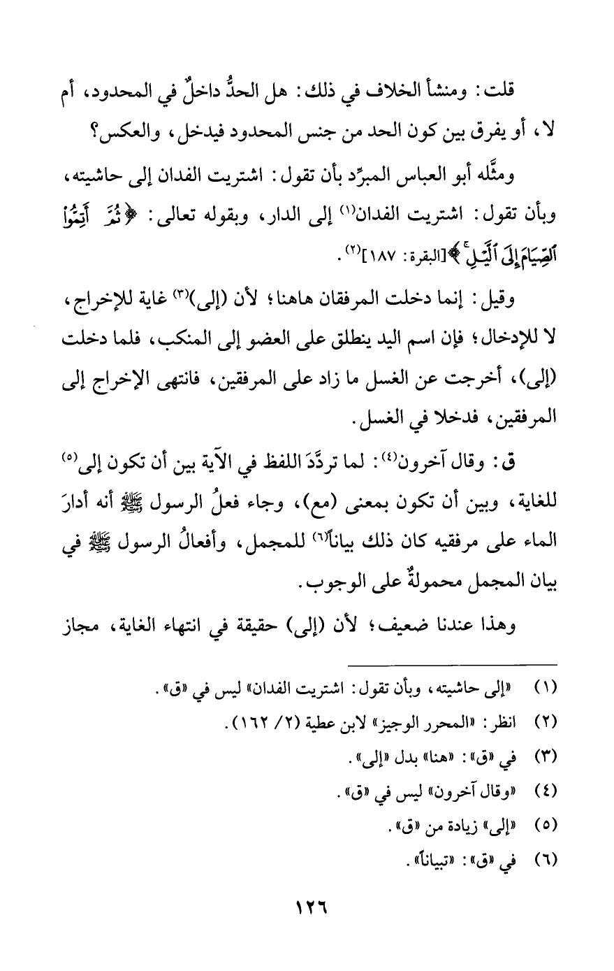 ومّثله أبو العباس المبرد بأن تقول: اشتريت الفدان إلى حاشيته، وبأن تقول: اشتريت الفدان (¬1) إلى الدار، وبقوله تعالى: {ثُمَّ أَتِمُّوا الصِّيَامَ إِلَى اللَّيْلِ} [البقرة: 187] (¬2).