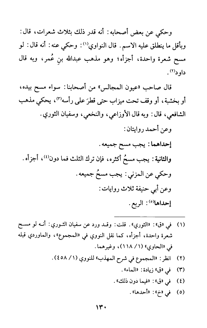 (¬1) في (ق): "الثوري. قلت: وقد ورد عن سفيان الثوري: أنه لو مسح شعرة واحدة، أجزأه، كما نقل النووي في «المجموع»، والماوردي في قبله في «الحاوي» (1/ 118)، وغيرهما.