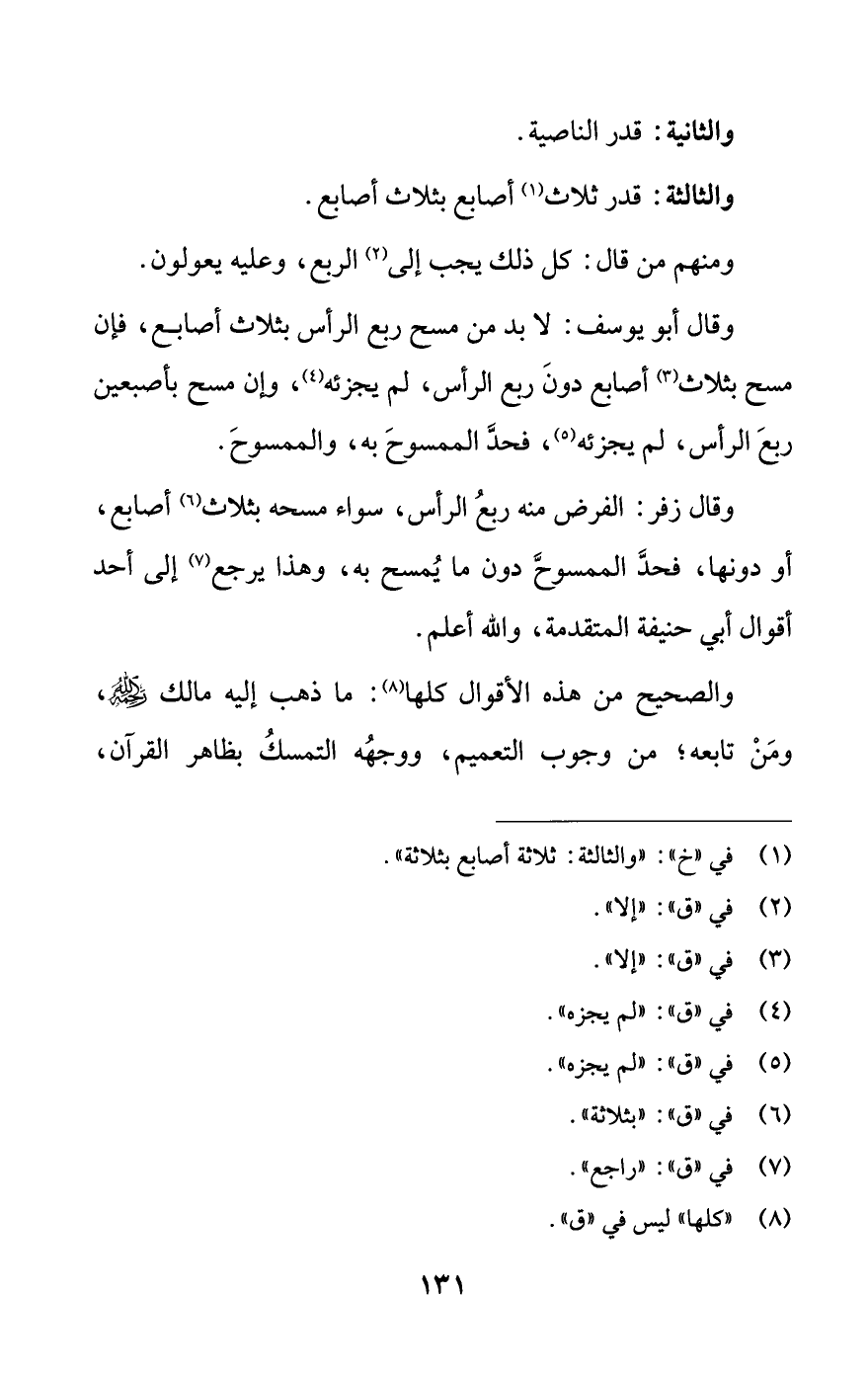 وقال زفر: الفرض منه ربع الرأس، سواء مسحه بثلاث (¬6) أصابع، أو دونها، فحد الممسوح دون ما يمسح به، وهذا يرجع (¬7) إلى أحد أقوال أبي حنيفة المتقدمة، والله أعلم.