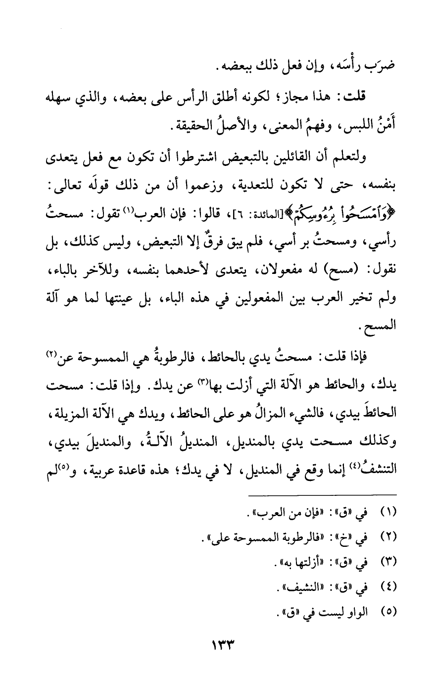 فإذا قلت: مسحت يدي بالحائط، فالرطوبة الممسوحة عن (¬2) يدك، والحائط هو الآلة التي أزلت بها (¬3) عن يدك. وإذا قلت: مسحت الحائط بيدي، فالشيء المزال هو على الحائط، ويدك هي الآلة المزيلة، وكذلك مسحت يدي بالمنديل، المنديل الآلة، والمنديل بيدي، التنشف (¬4) إنما وقع في المنديل، لا في يدك؛ هذه قاعدة عربية، و (¬5) لم