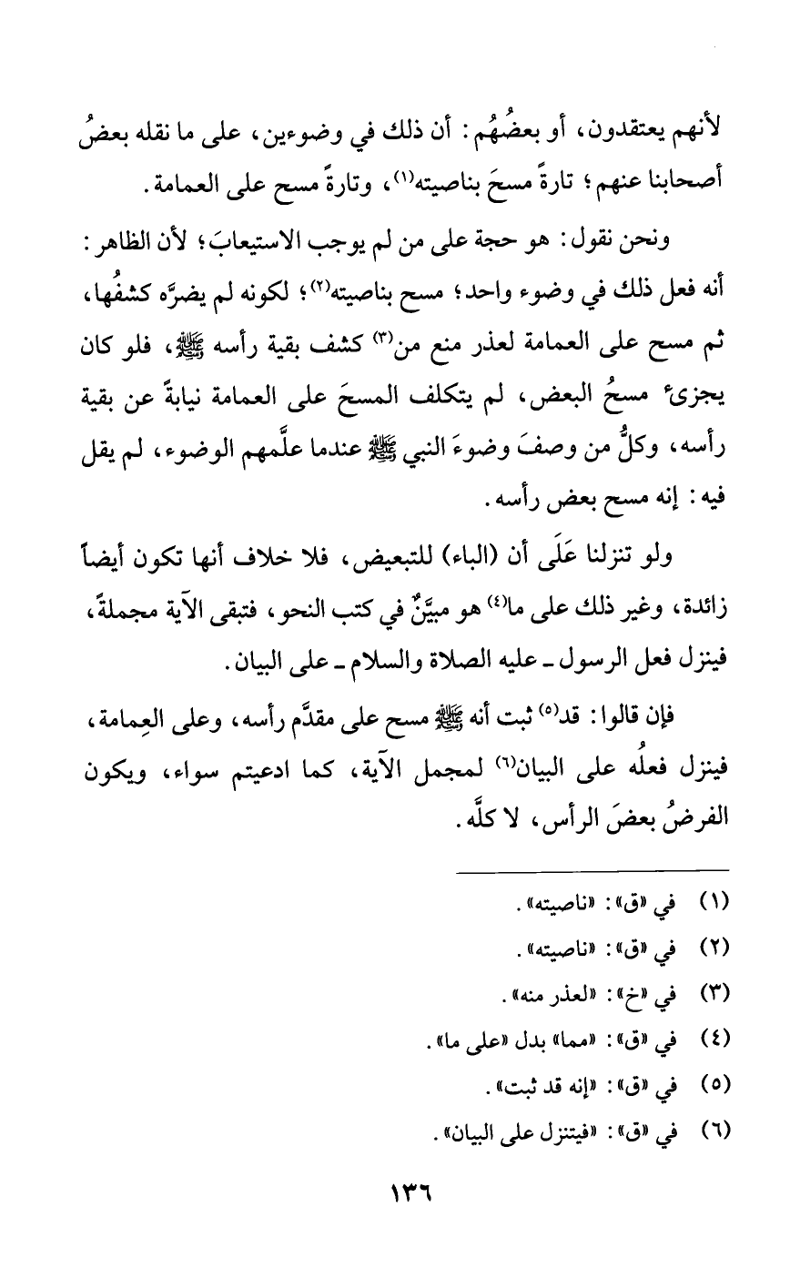 فإن قالوا: قد (¬5) ثبت أنه - صلى الله عليه وسلم - مسح على مقدم رأسه، وعلى العمامة، فينزل فعله على البيان (¬6) لمجمل الآية، كما ادعيتم سواء، ويكون الفرض بعض الرأس، لا كله.