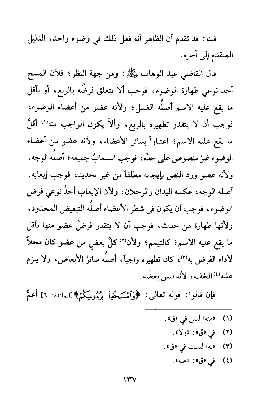 قال القاضي عبد الوهاب رحمه الله: ومن جهة النظر؛ فلأن المسح أحد نوعي طهارة الوضوء، فوجب أَلَّا يتعلق فرضه بالربع، أو بأقل ما يقع عليه الاسم أصله الغسل؛ ولأنه عضو من أعضاء الوضوء، فوجب أن لا يتقدر تطهيره بالربع، وَأَلَّا يكون الواجب منه (¬1) أقل ما يقع عليه الاسم؛ اعتبارا بسائر الأعضاء، ولأنه عضو من أعضاء الوضوء غير منصوص على حده، فوجب استيعاب جميعه؛ أصله الوجه، ولأنه عضو ورد النص بإيجابه مطلقًا من غير تحديد، فوجب إيعابه، أصله الوجه، عكسه اليدان والرجلان، ولأن الإيعاب أحد نوعي فرض الوضوء، فوجب أن يكون في شطر الأعضاء أصله التبعيض المحدود، ولأنها طهارة من حدث، فوجب أن لا يتقدر فرض عضو منها بأقل ما يقع عليه الاسم؛ كالتيمم؛ ولأن (¬2) كل بعض من عضو كان محلاً لأداء الفرض به (¬3)، كان تطهيره واجبا، أصله سائر الأبعاض، ولا يلزم عليه (¬4) الخف؛ لأنه ليس بعضه.