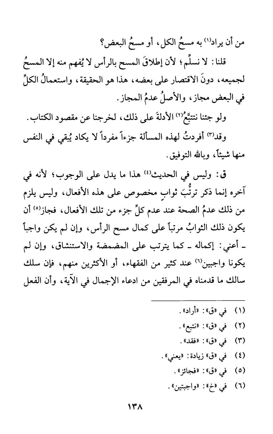 ق: وليس في الحديث (¬4) هذا ما يدل على الوجوب؛ لأنه في آخره إنما ذكر ترتب ثواب مخصوص على هذه الأفعال، وليس يلزم من ذلك عدم الصحة عند عدم كل جزء من تلك الأفعال، فجاز (¬5) أن يكون ذلك الثواب مرتبا على كمال مسح الرأس، وإن لم يكن واجبا - أعني: إكماله- كما يترتب على المضمضة والاستنشاق، وإن لم يكونا واجبين (¬6) عند كثير من الفقهاء، أو الأكثرين منهم، فإن سلك سالك ما قدمناه في المرفقين من ادعاء الإجمال في الآية، وأن الفعل