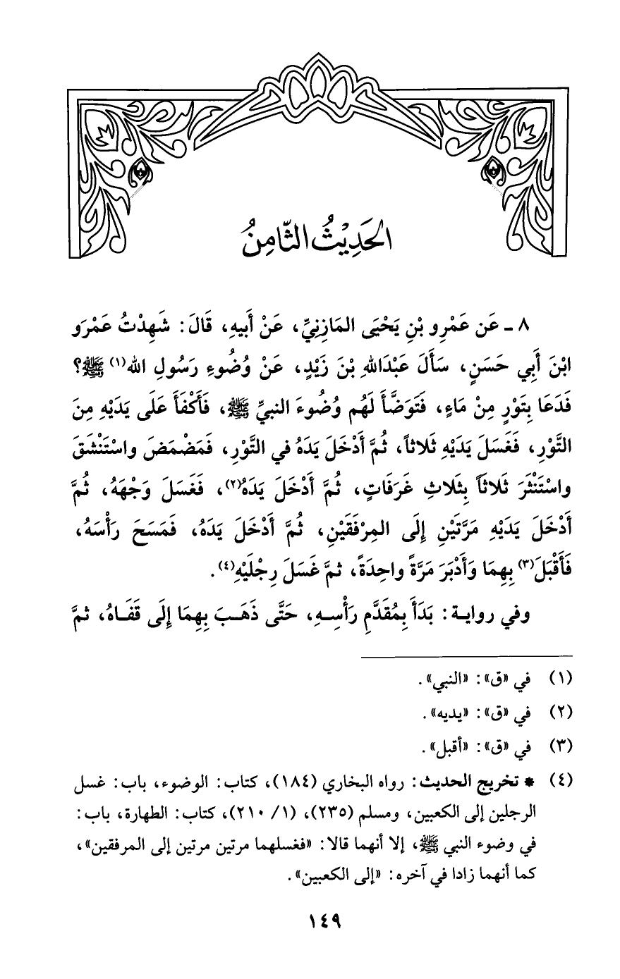 8 - عَنْ عَمْرِو بْنِ يَحْيَى الْمَازِنِيِّ، عَنْ أَبِيهِ، قَالَ: شَهِدْتُ عَمْرَو بْنَ أَبِي حَسَنٍ، سَأَلَ عَبْدَ اللَّهِ بْنَ زَيْدٍ، عَنْ وُضُوءِ رَسُولِ اللَّهِ (¬1) - صلى الله عليه وسلم -؟ فَدَعَا بِتَوْرٍ مِنْ مَاءٍ , فَتَوَضَّأَ لَهُمْ وُضُوءَ النَّبِيِّ - صلى الله عليه وسلم -، فَأَكْفَأَ عَلَى يَدَيْهِ مِنْ التَّوْرِ , فَغَسَلَ يَدَيْهِ ثَلاثاً , ثُمَّ أَدْخَلَ يَدَهُ فِي التَّوْرِ , فَمَضْمَضَ وَاسْتَنْشَقَ وَاسْتَنْثَرَ ثَلاثاً بِثَلاثِ غَرْفَاتٍ , ثُمَّ أَدْخَلَ يَدَهُ (¬2)، فَغَسَلَ وَجْهَهُ، ثُمَّ أَدْخَلَ يَديْهِ مَرَّتَيْنِ إلَى الْمِرْفَقَيْنِ، ثُمَّ أَدْخَلَ يَدَهُ, فَمَسَحَ رَأْسَهُ , فَأَقْبَلَ (¬3) بِهِمَا وَأَدْبَرَ مَرَّةً وَاحِدَةً، ثُمَّ غَسَلَ رِجْلَيْهِ (¬4).