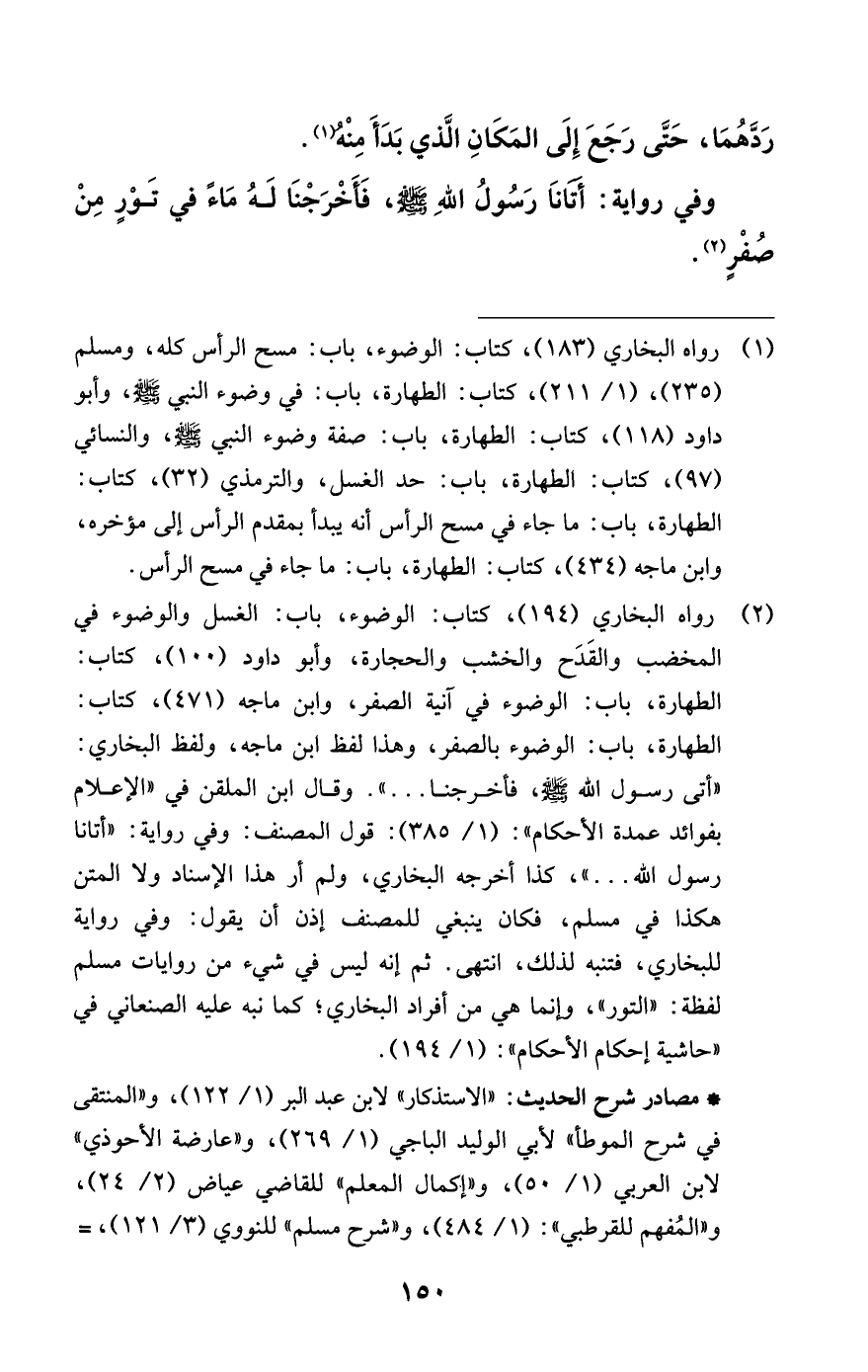 (¬1) رواه البخاري (183)، كتاب: الوضوء، باب: مسح الرأس كله، ومسلم (235)، (1/ 211)، كتاب: الطهارة، باب: في وضوء النبي - صلى الله عليه وسلم -، وأبو داود (118)، كتاب: الطهارة، باب: صفة وضوء النبي - صلى الله عليه وسلم -، والنسائي (97)، كتاب: الطهارة، باب: حد الغسل، والترمذي (32)، كتاب: الطهارة، باب: ما جاء في مسح الرأس أنه يبدأ بمقدم الرأس إلى مؤخره، وابن ماجه (434)، كتاب: الطهارة، باب: ما جاء في مسح الرأس.