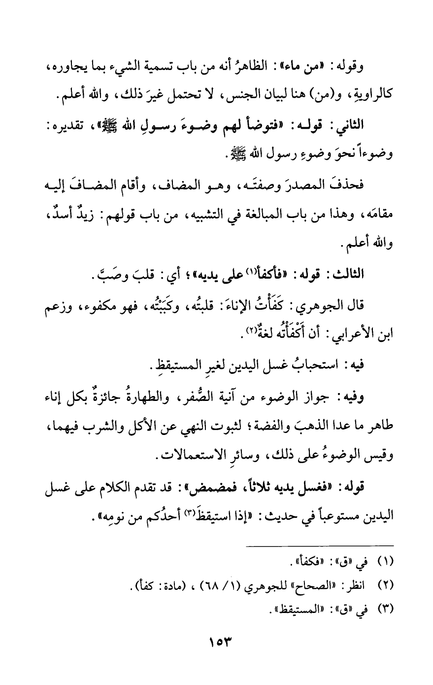 وقوله: «من ماء»: الظاهر أنه من باب تسمية الشيء بما يجاوره، كالراوية، و (من) هنا لبيان الجنس، لا تحتمل غير ذلك، والله أعلم.