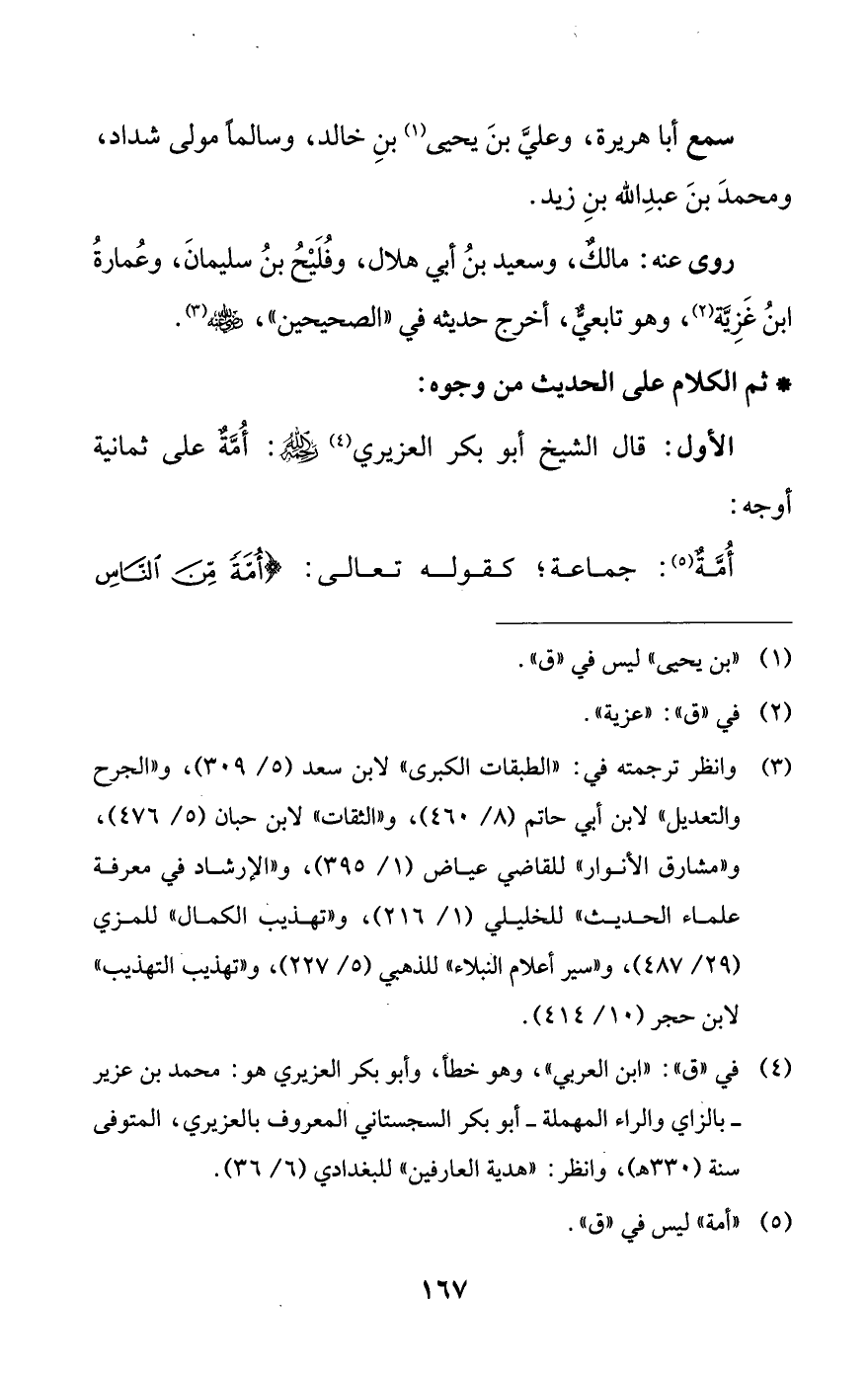 (¬3) وانظر ترجمته في: «الطبقات الكبرى» لابن سعد (5/ 309)، و «الجرح والتعديل» لابن أبي حاتم (8/ 420)، و «الثقات» لابن حبان (5/ 476)، و «مشارق الأنوار» للقاضي عياض (1/ 395)، و «الإرشاد في معرفة علماء الحديث» للخليلي (1/ 216)، و «تهذيب الكمال» للمزي (29/ 487)، و «سير أعلام النبلاء» للذهبي (5/ 227)، و «تهذيب التهذيب» لابن حجر (10/ 414).