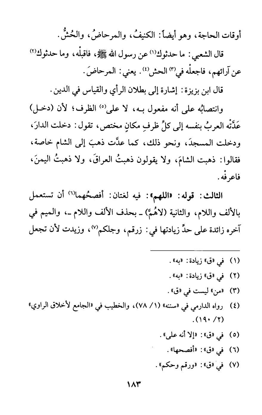 أوقات الحاجة، وهو أيضا: الكنيف، والمرحاض، والحُش. قال الشعبي: ما حدثوك (¬1) عن رسول الله - صلى الله عليه وسلم -، فاقبله، وما حدثوك (¬2) عن آرائهم، فاجعله في (¬3) الحُش (¬4). يعني: المرحاض.