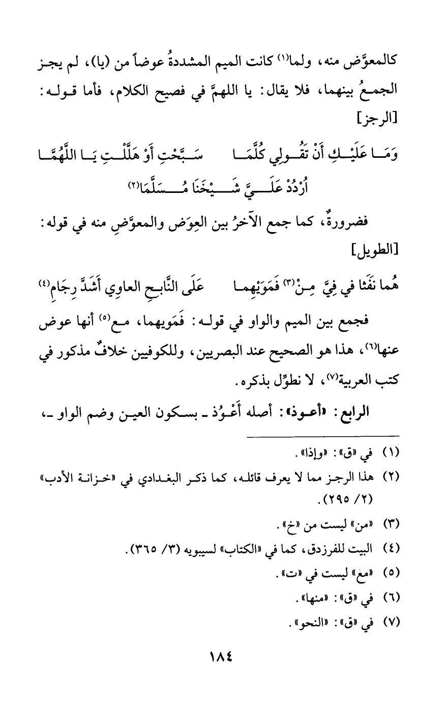 فجمع بين الميم والواو في قوله: فمويهما، مع (¬5) أنها عوض عنها (¬6)، هذا هو الصحيح عند البصريين، وللكوفيين خلاف مذكور في كتب العربية (¬7)، لا نطول بذكره.