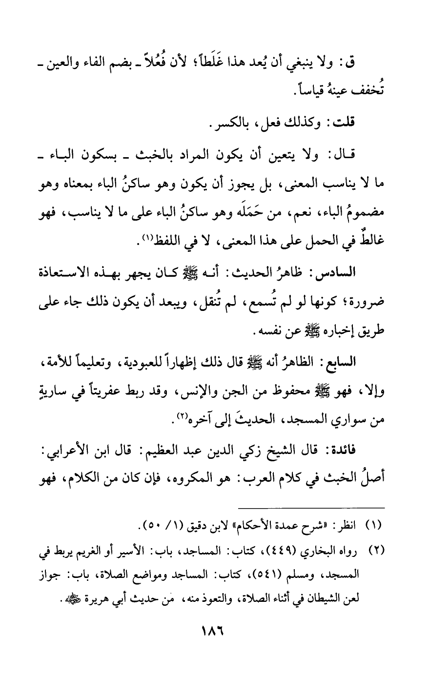 قال: ولا يتعين أن يكون المراد بالخبث -بسكون الباء - ما لا يناسب المعنى، بل يجوز أن يكون وهو ساكن الباء بمعناه وهو مضموم الباء، نعم، من حمله وهو ساكن الباء على ما لا يناسب، فهو غالط في الحمل على هذا المعنى، لا في اللفظ (¬1).