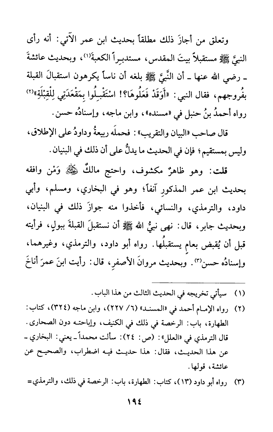 قلت: وهو ظاهر مكشوف، واحتج مالك رحمه الله ومن وافقه بحديث ابن عمر المذكور آنفًا؛ وهو في البخاري، ومسلم، وأبي داود، والترمذي، والنسائي، فأخذوا منه جواز ذلك في البنيان، وبحديث جابر، قال: نهى نبي الله - صلى الله عليه وسلم - أن نستقبل القبلة ببول، فرأيته قبل أن يقبض بعام يستقبلها. رواه أبو داود، والترمذي، وغيرهما، وإسناده حسن (¬3). وبحديث مروان الأصفر، قال: رأيت ابن عمر أناخ