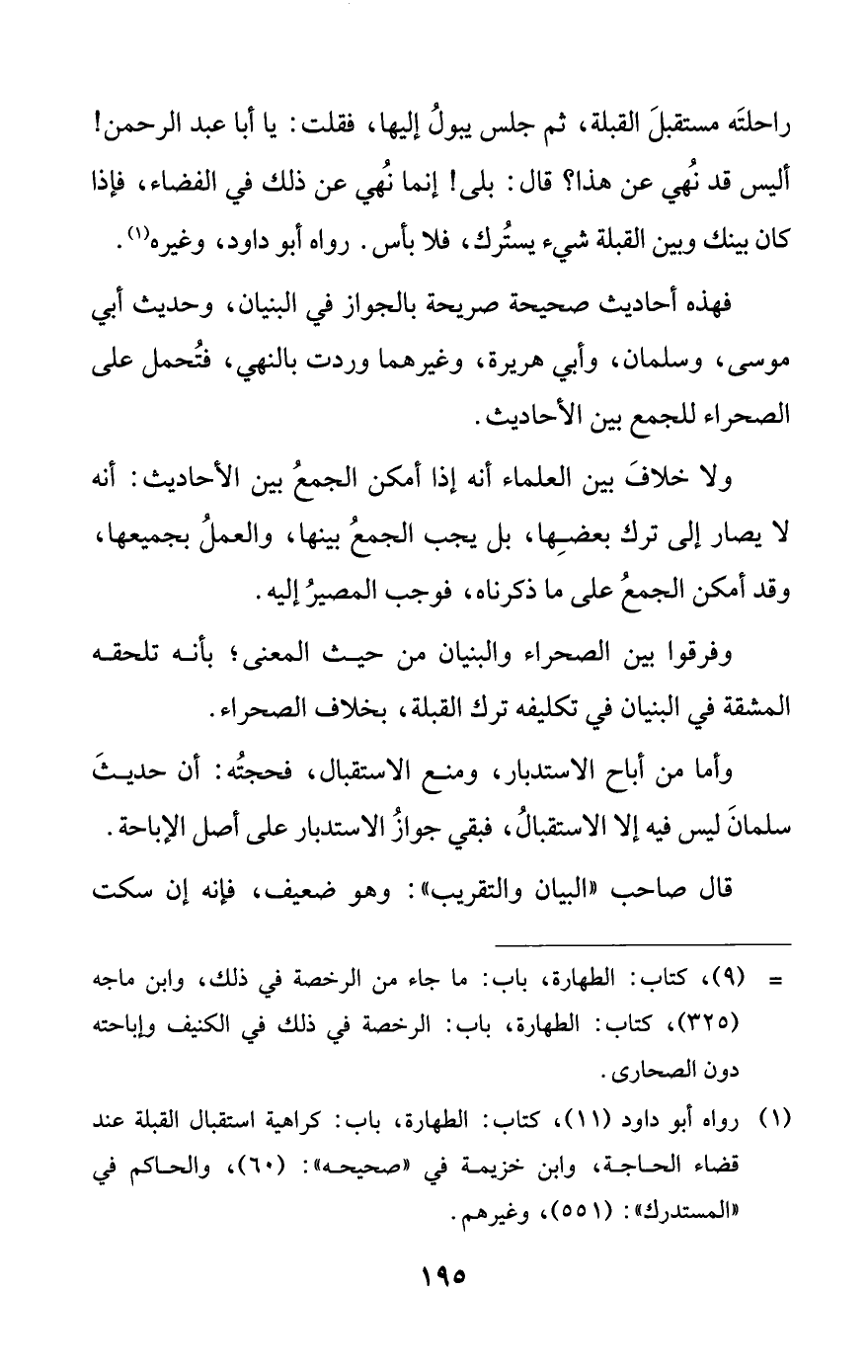 فهذه أحاديث صحيحة صريحة بالجواز في البنيان، وحديث أبي موسى، وسلمان، وأبي هريرة، وغيرهما وردت بالنهي، فتحمل على الصحراء للجمع بين الأحاديث.
