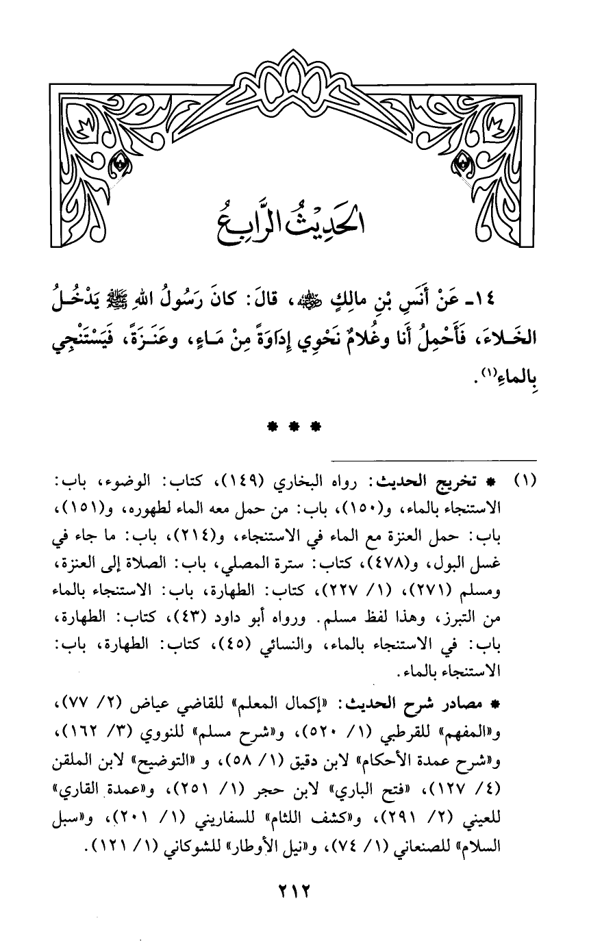 14 - عَنْ أَنَسِ بْنِ مَالِكٍ - رضي الله عنه -، أَنَّهُ قَالَ: كَانَ رَسُولُ اللَّهِ - صلى الله عليه وسلم - يَدْخُلُ الْخَلاءَ , فَأَحْمِلُ أَنَا وَغُلامٌ نَحْوِي إدَاوَةً مِنْ مَاءٍ، وَعَنَزَةً , فَيَسْتَنْجِي بِالْمَاءِ (¬1).