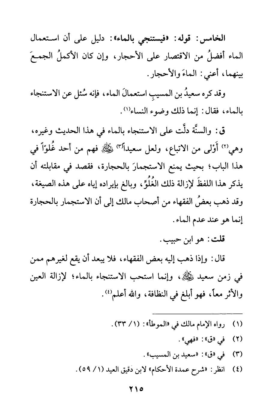_قال: وإذا ذهب إليه بعض الفقهاء، فلا يبعد أن يقع لغيرهم ممن في زمن سعيد -رحمه الله-، وإنما استحب الاستنجاء بالماء؛ لإزالة العين والأثر معا، فهو أبلغ في النظافة، والله أعلم (¬4).