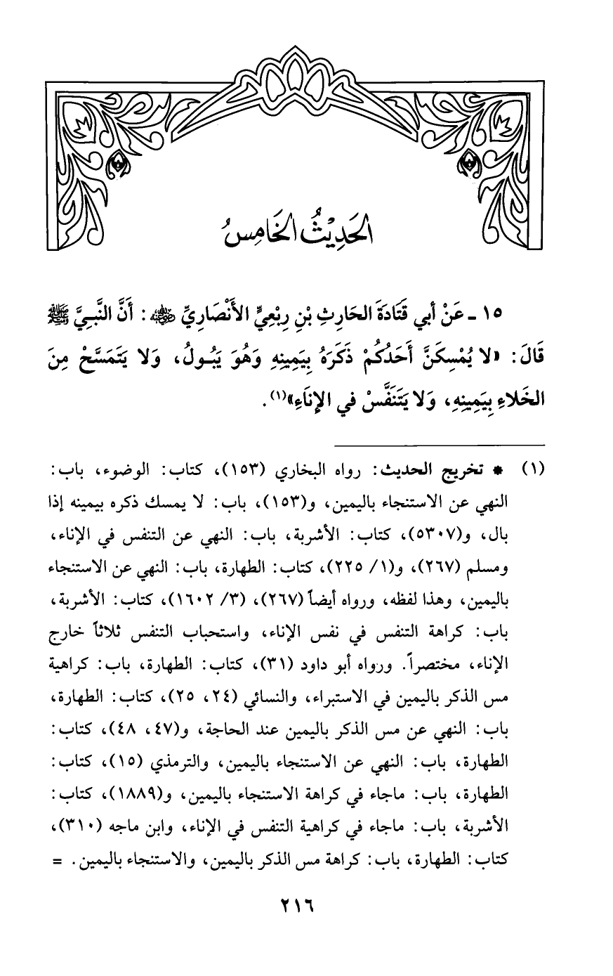 15 - عَنْ أَبِي قَتَادَةَ الْحَارِثِ بْنِ رِبْعِيٍّ الأَنْصَارِيِّ - رضي الله عنه -: أَنَّ النَّبِيَّ - صلى الله عليه وسلم - قَالَ: «لا يُمْسِكَنَّ أَحَدُكُمْ ذَكَرَهُ بِيَمِينِهِ وَهُوَ يَبُولُ، وَلا يَتَمَسَّحْ مِنْ الْخَلاءِ بِيَمِينِهِ، وَلا يَتَنَفَّسْ فِي الإِنَاءِ» (¬1).