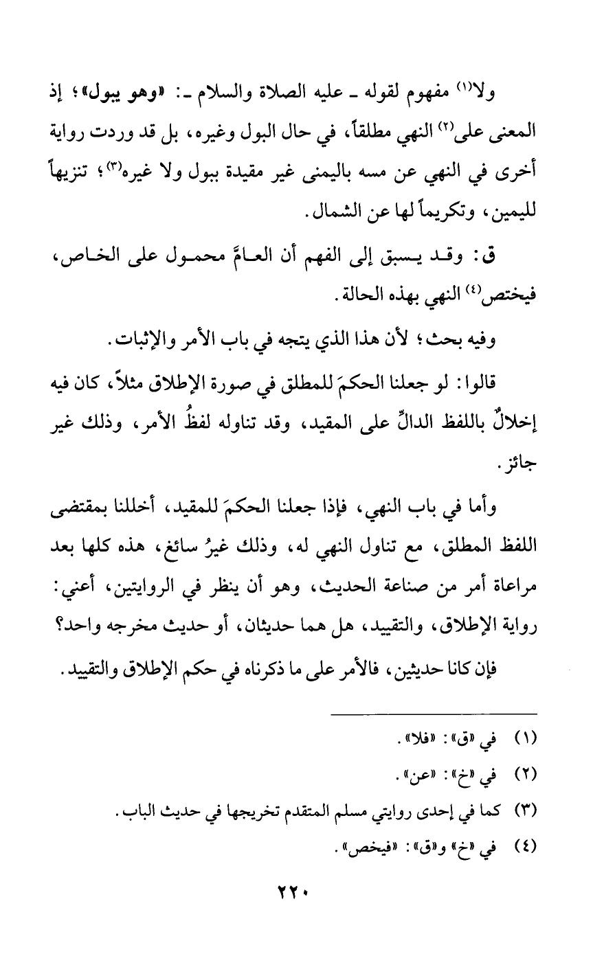 وأما في باب النهي، فإذا جعلنا الحكم للمقيد، أخللنا بمقتضى اللفظ المطلق، مع تناول النهي له، وذلك غير سائغ، هذه كلها بعد مراعاة أمر من صناعة الحديث، وهو أن ينظر في الروايتين، أعني: رواية الإطلاق، والتقييد، هل هما حديثان، أو حديث مخرجه واحد؟ فإن كانا حديثين، فالأمر على ما ذكرناه في حكم الإطلاق والتقييد.