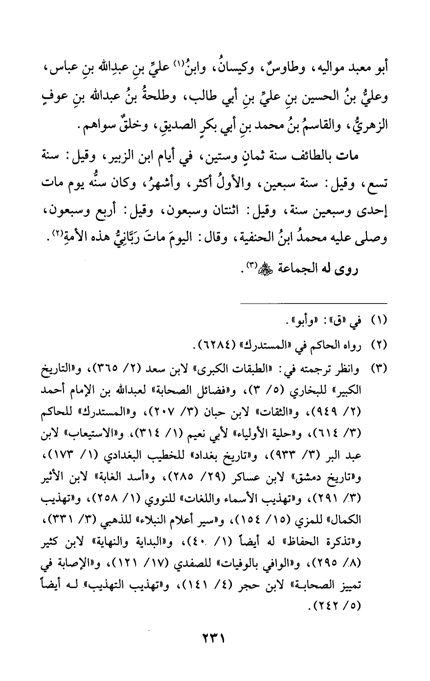 (¬3) وانظر ترجمته في: «الطبقات الكبرى» لابن سعد (2/ 365)، و «التاريخ الكبير» للبخاري (5/ 3)، و «فضائل الصحابة» لعبد الله بن الإمام أحمد (2/ 949)، و «الثقات» لابن حبان (3/ 207)، و «المستدرك» للحاكم (3/ 614)، و (حلية الأولياء» لأبي نعيم (1/ 314)، و «الاستيعاب» لابن عبد البر (3/ 933)، و «تاريخ بغداد» للخطيب البغدادي (1/ 173)، و «تاريخ دمشق» لابن عساكر (29/ 285)، و «أسد الغابة» لابن الأثير (3/ 291)، و «تهذيب الأسماء واللغات» للنووي (1/ 258)، و «تهذيب الكمال» للمزي (15/ 154)، و «سير أعلام النبلاء» للذهبي (3/ 331)، و «تذكرة الحفاظ» له أيضا (1/ 40)، و «البداية والنهاية» لابن كثير (8/ 295)، و «الوافي بالوفيات» للصفدي (17/ 121)، و «الإصابة في تمييز الصحابة» لابن حجر (4/ 141)، و «تهذيب التهذيب» له أيضا (5/ 242).