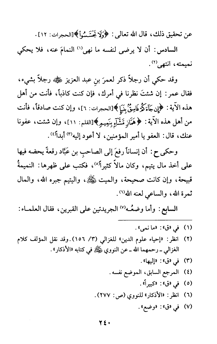 وقد حكي أن رجلاً ذكر لعمر بن عبد العزيز- رضي الله عنه- رجلاً بشيء، فقال عمر: إن شئت نظرنا في أمرك، فإن كنت كاذبا، فأنت من أهل هذه الآية: {إِنْ جَاءَكُمْ فَاسِقٌ بِنَبَإٍ} [الحجرات: 6]، وإن كنت صادقًا، فأنت من أهل هذه الآية {هَمَّازٍ مَشَّاءٍ بِنَمِيمٍ} [القلم: 11]، وإن شئت، عفونا عنك، قال: العفو يا أمير المؤمنين، لا أعود إليه (¬3) أبدا (¬4).
