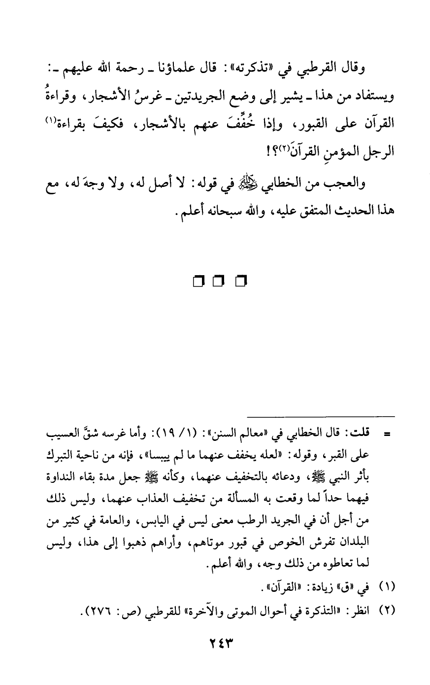 وقال القرطبي في «تذكرته»: قال علماؤنا -رحمة الله عليهم-: ويستفاد من هذا- يشير إلى وضع الجريدتين- غرس الأشجار، وقراءة القرآن على القبور، وإذا خّفف عنهم بالأشجار، فكيف بقراءة (¬1) الرجل المؤمن القرآن (¬2)؟!
