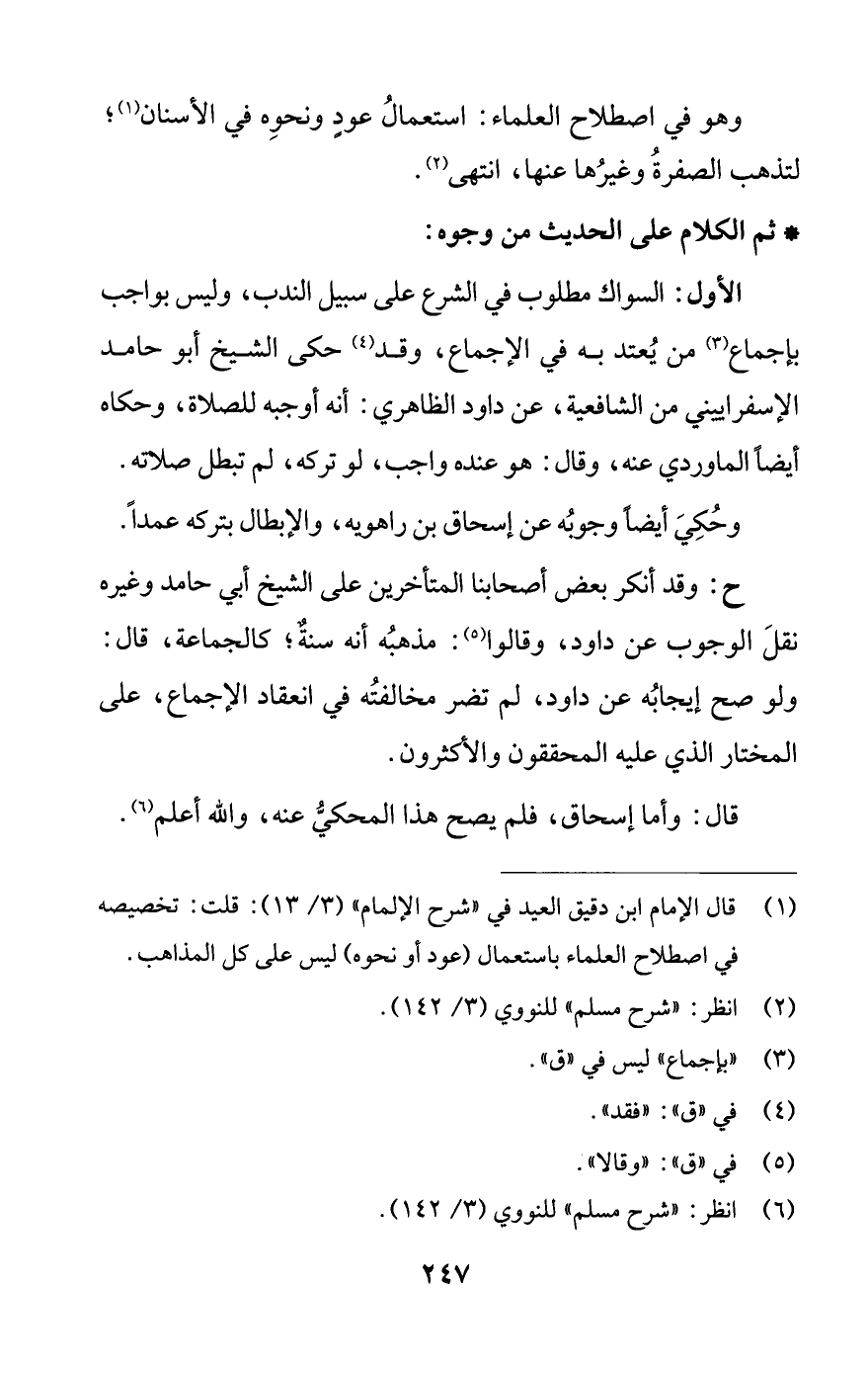 (¬1) قال الإمام ابن دقيق العيد في «شرح الإلمام» (3/ 13): قلت: تخصيصه في اصطلاح العلماء باستعمال (عود أو نحوه) ليس على كل المذاهب.
