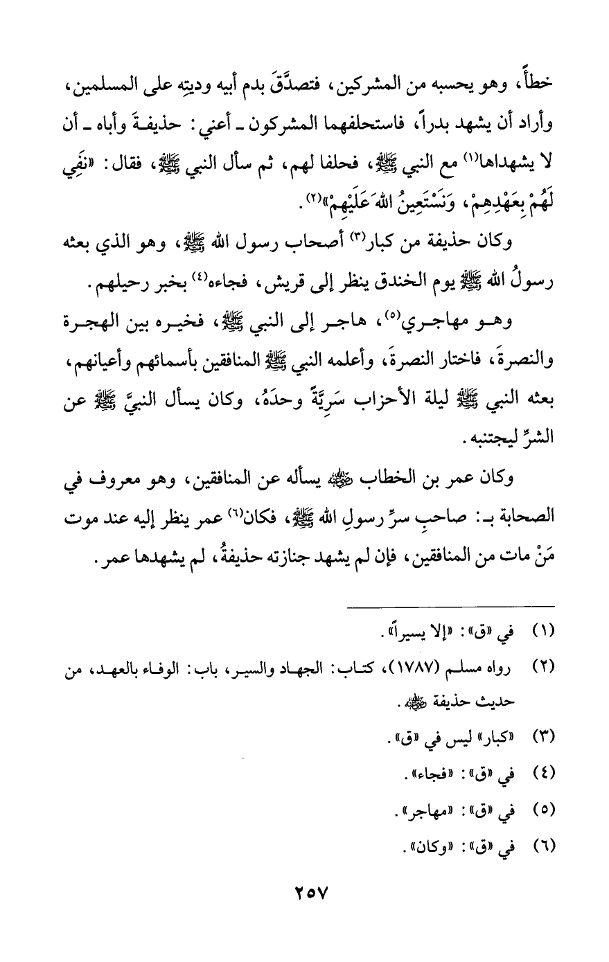 خطأً، وهو يحسبه من المشركين، فتصدق بدم أبيه وديته على المسلمين، وأراد أن يشهد بدرا، فاستحلفهما المشركون - أعني: حذيفة وأباه - أن لا يشهداها (¬1) مع النبي - صلى الله عليه وسلم -، فحلفا لهم، ثم سأل النبي، - صلى الله عليه وسلم -، فقال: «نفي لهم بعهدهم، ونستعين الله عليهم» (¬2).
