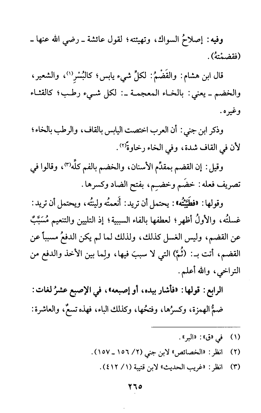 وقيل: إن القضم بمقدم الأسنان، والخضم بالفم كله (¬3)، وقالوا في تصريف فعله: خضم وخضِم، بفتح الضاد وكسرها.