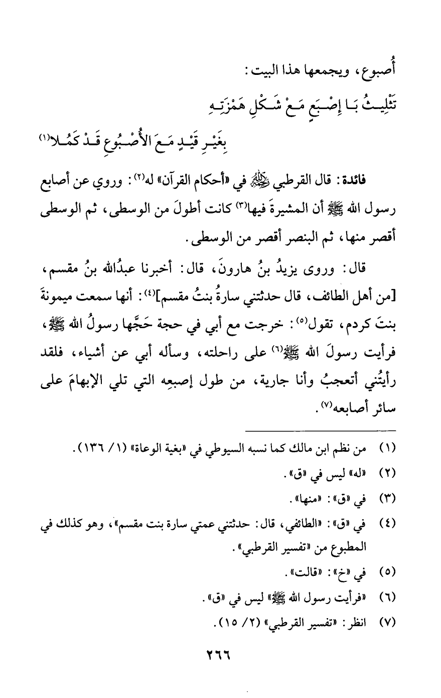 فائدة: قال القرطبي - رحمه الله - فيأحكام القرآن له (¬2): وروي عن أصابع رسول الله - صلى الله عليه وسلم - أن المشيرة فيها (¬3) كانت أطول من الوسطى، ثم الوسطى أقصر منها، ثم البنصر أقصر من الوسطى.