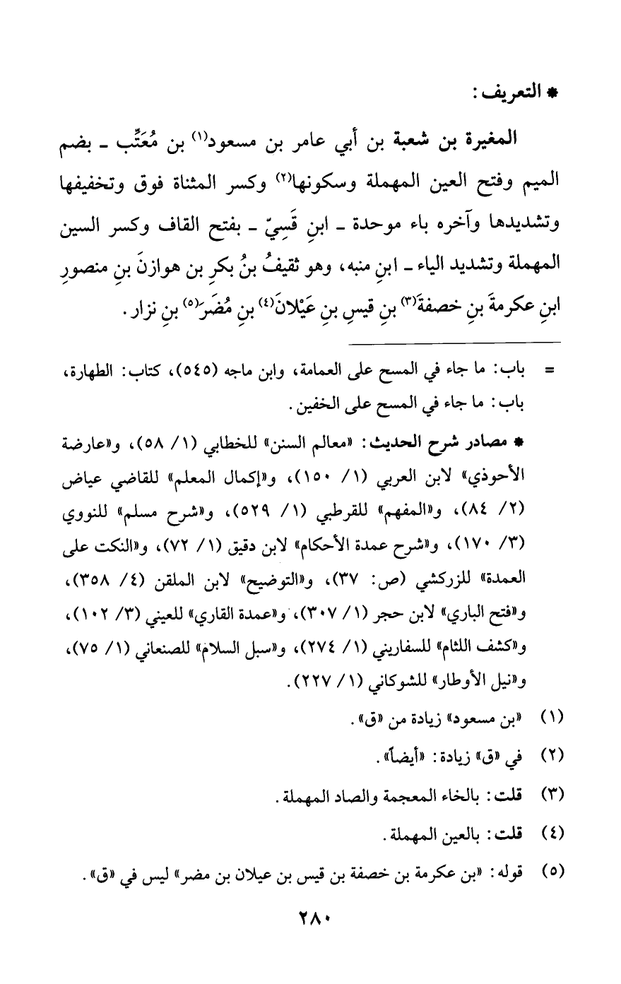 المغيرة بن شعبة بن أبي عامر بن مسعود (¬1) بن مُعَتِّب - بضم الميم وفتح العين المهملة وسكونها (¬2) وكسر المثناة فوق وتخفيفها وتشديدها وآخره باء موحدة - ابنِ قَسِيّ - بفتح القاف وكسر السين المهملة وتشديد الياء - ابنِ منبه، وهو ثقيفُ بنُ بكرِ بن هوازنَ بنِ منصورِ ابنِ عكرمةَ بنِ خصفةَ (¬3) بنِ قيسِ بنِ عَيْلانَ (¬4) بنِ مُضَرَ (¬5) بنِ نزار.