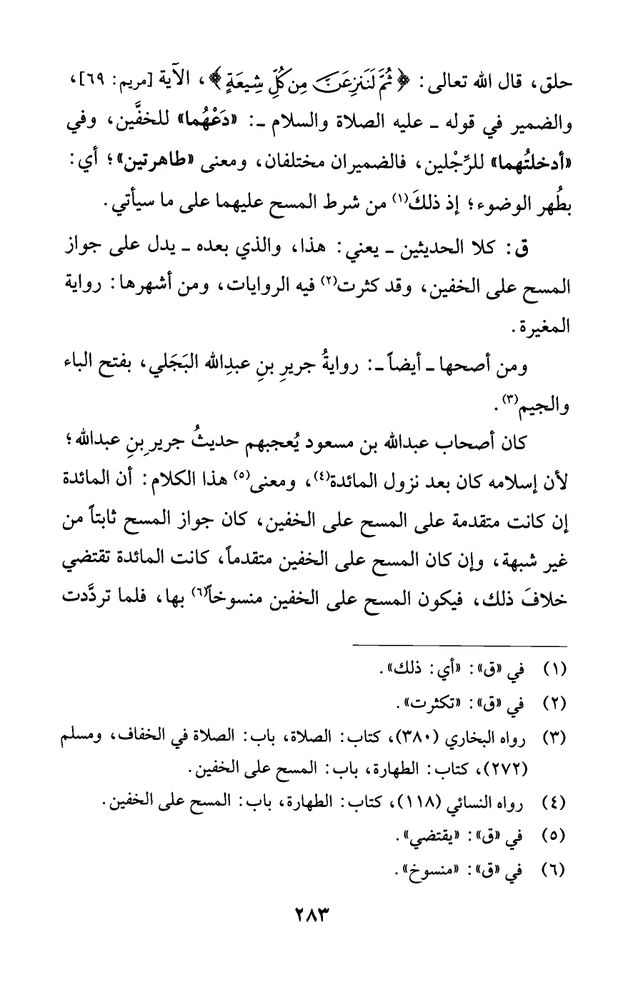 ق: كلا الحديثين -يعني: هذا، والذي بعده- يدل على جواز المسح على الخفين، وقد كثرت (¬2) فيه الروايات، ومن أشهرها: رواية المغيرة.