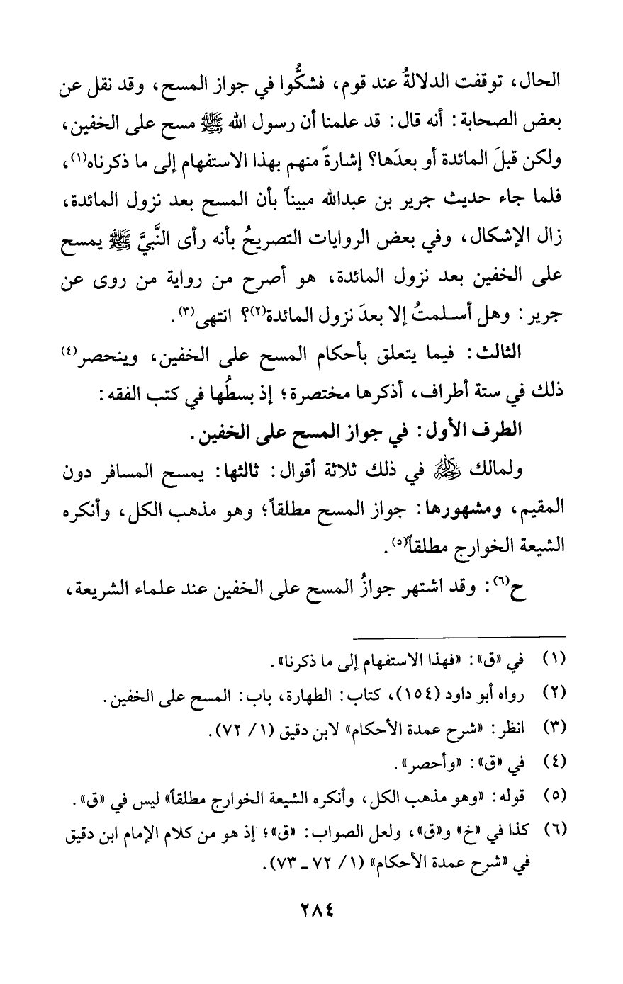 ح (¬6): وقد اشتهر جواز المسح على الخفين عند علماء الشريعة،