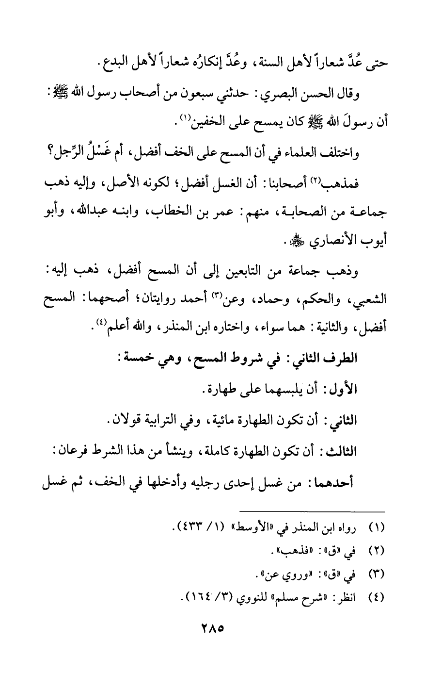 الطرف الثاني: في شروط المسح، وهي خمسة: