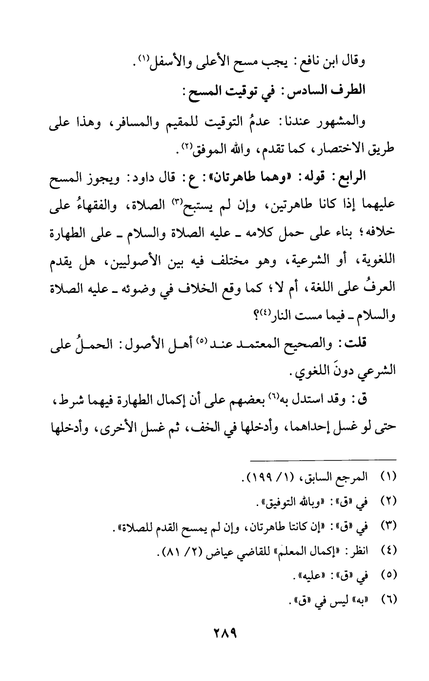 الرابع: قوله: وهما طاهرتان: ع: قال داود: ويجوز المسح عليهما إذا كانا طاهرتين، وإن لم يستبح (¬3) الصلاة، والفقهاء على خلافه؛ بناء على حمل كلامه- عليه الصلاة والسلام- على الطهارة اللغوية، أو الشرعية، وهو مختلف فيه بين الأصوليين، هل يقدم العرف على اللغة، أم لا؛ كما وقع الخلاف في وضوئه- عليه الصلاة والسلام-فيما مست النار (¬4)؟