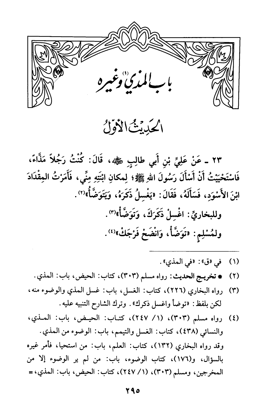 23 - عَنْ عَلِيِّ بْنِ أَبِي طَالِبٍ - رضي الله عنه -، قَالَ: كُنْتُ رَجُلاً مَذَّاءً , فَاسْتَحْيَيْتُ أَنْ أَسْأَلَ رَسُولَ اللَّهِ - صلى الله عليه وسلم -؛ لِمَكَانِ ابْنَتِهِ مِنِّي , فَأَمَرْتُ الْمِقْدَادَ بْنَ الأَسْوَدِ، فَسَأَلَهُ , فَقَالَ: «يَغْسِلُ ذَكَرَهُ , وَيَتَوَضَّأُ» (¬2).