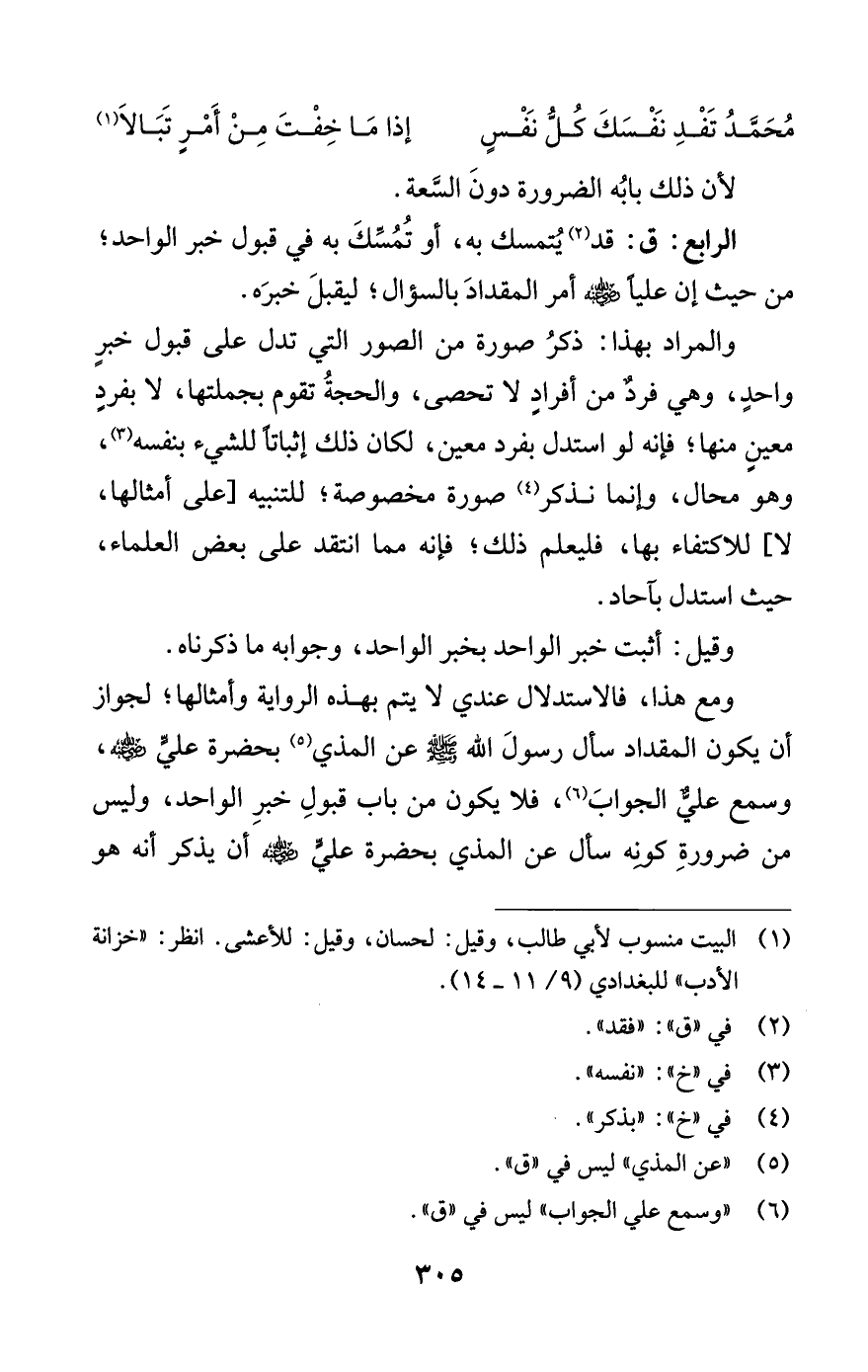 الرابع: ق: قد (¬2) يُتمسك به، أو تُمُسِّكَ به في قبول خبر الواحد؛ من حيث إن عَلِيًّا -رضي الله عنه- أمر المقدادَ بالسؤال؛ ليقبلَ خبرَه.