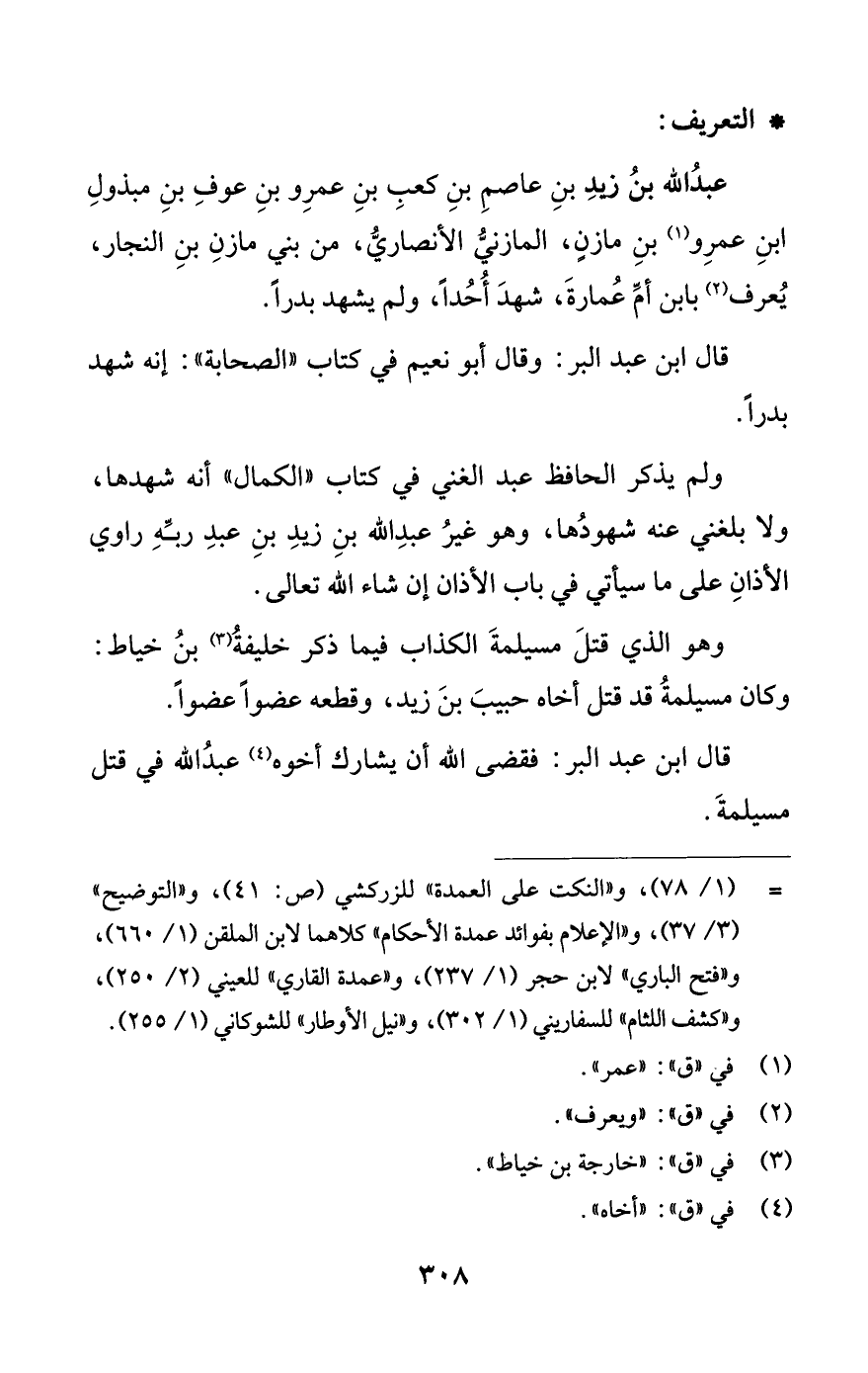 ولم يذكر الحافظ عبد الغني في كتاب «الكمال» أنه شهدها، ولا بلغني عنه شهودها، وهو غير عبد الله بن زيد بن عبد ربه راوي الأذان على ما سيأتي في باب الأذان -إن شاء الله تعالى-.