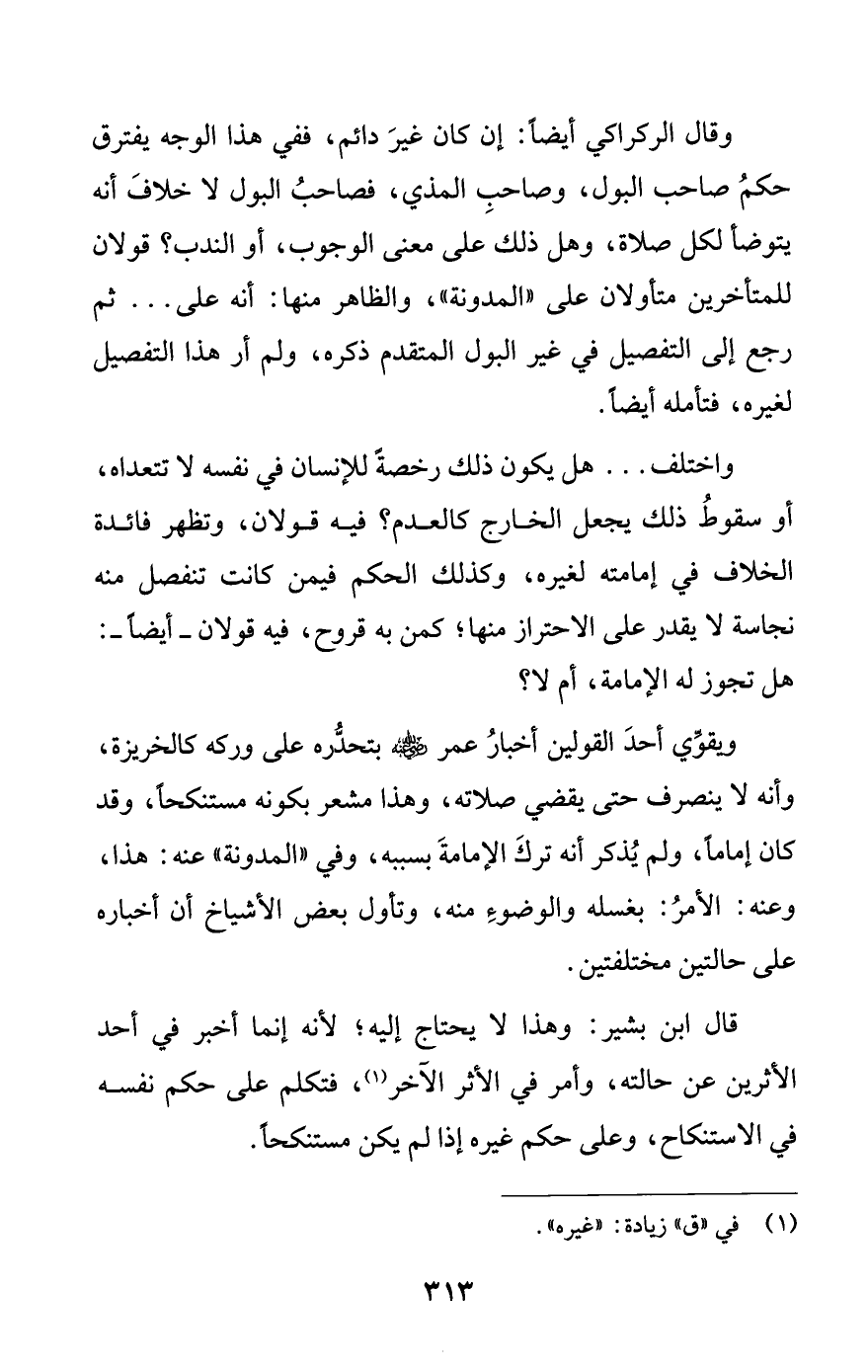 ويقوِّي أحد القولين أخبارُ عمر -رضي الله عنه- بتحدُّره على وركه كالخُريزة، وأنه لا ينصرف حتى يقضي صلاته، وهذا مشعر بكونه مستنكحا، وقد كان إماما، ولم يذكر أنه ترك الإمامة بسببه، وفي «المدونة» عنه: هذا، وعنه: الأمرُ: بغسله والوضوءِ منه، وتأول بعض الأشياخ أن أخباره على حالتين مختلفتين.